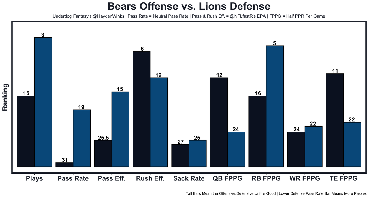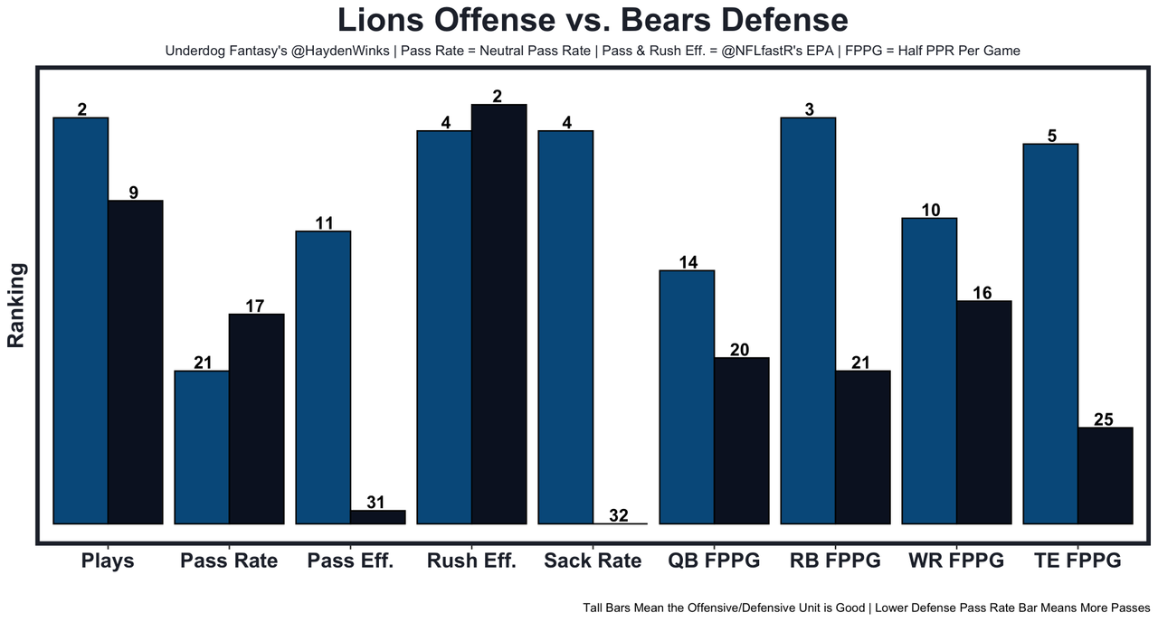 The Lions own the 2nd-highest team total of the week, but once this team gets to the red zone, they have one of the highest run rates in the NFL, especially with David Montgomery back. Goff still has 3 games of 300+ passing yards and is capable of dicing up a Bears defense that's 31st in passing EPA allowed. In two games last year, Goff had 255-3-0 and 236-1-0 passing lines as the team dropped 41 and 31 points. The addition of EDGE1 Montez Sweat should at least improve the Bears' league-worst sack rate down the stretch.
