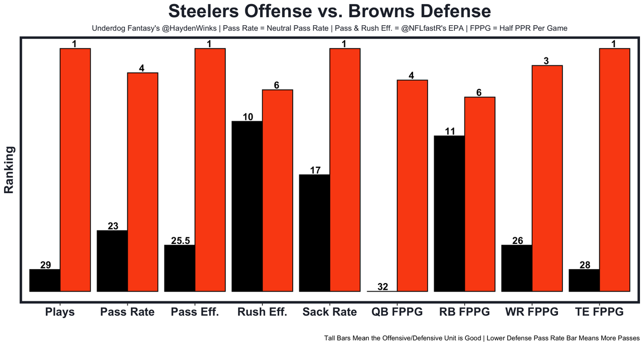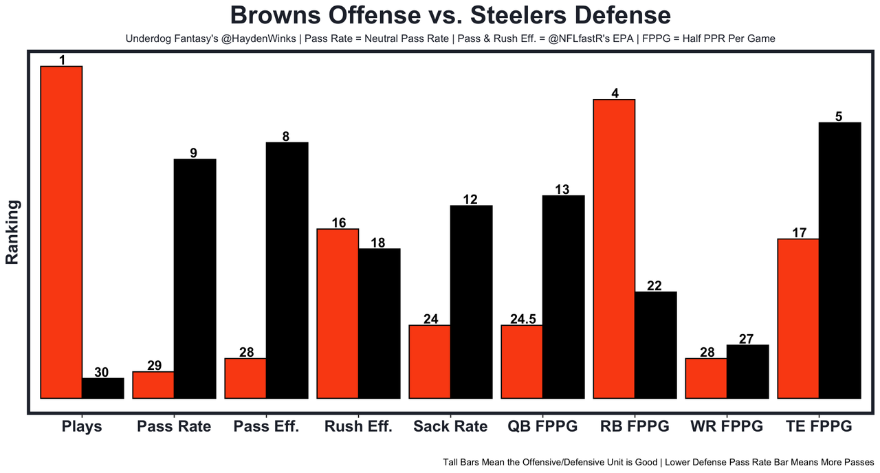 Amari Cooper - Dorian Thompson-Robinson wasn't ready in his first start (one without a lot of lead time), so he should do better here. That said, the Steelers are a tough draw for an inexperienced Day 3 rookie. Cooper is a total baller still, and Pittsburgh is at least missing star S Minkah Fitzpatrick while ranking 27th against fantasy WRs this year. 46.5 receiving yards in Pick'em.