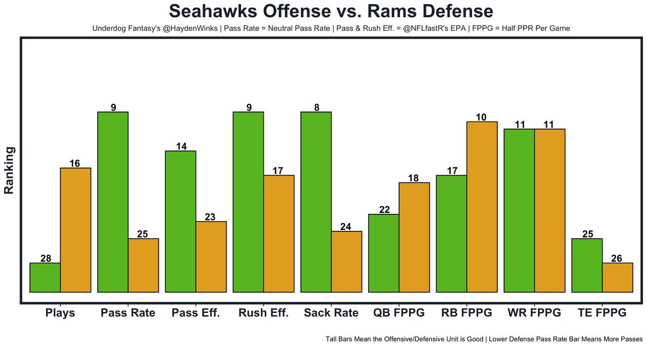 Darrell Henderson - The Seahawks are 5th-worst against fantasy RBs, though they just added DT Leonard Williams. Henderson will operate as the starter and favorite for receiving work, while thiccccccc Royce Freeman is the better pure rusher and threat at the goal line. Having Stafford back is huge, while Kyren Williams (ankle) is one week away from availability. Henderson had 14.9 and 9.9 expected half PPR points with Stafford to Freeman's 5.3 and 6.5. 59.5 total yards in Pick'em.
