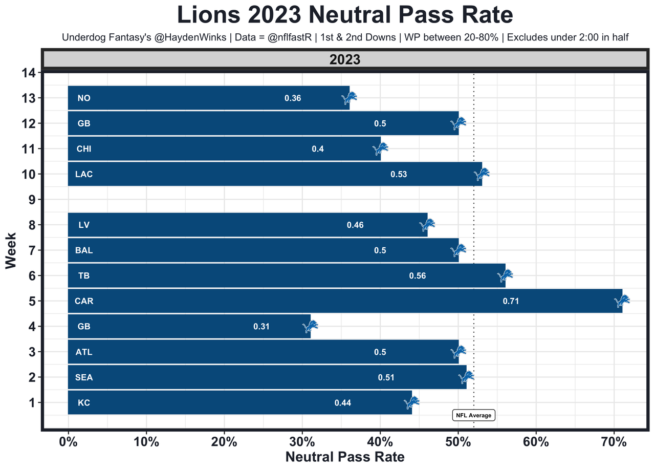 David Montgomery - He's averaging 17.1 half PPPR points on 14.7 expected half PPR with Jahmyr Gibbs as his complementary back. Those are RB1 numbers, especially when the Lions catch positive game script like they did last week. The Lions are 3.0-point favorites against a decent Bears run defense, but Detroit is 2nd in RB usage this month with a run-first identity. In fact, the Lions had a 40% neutral pass rate against Chicago just 3 weeks ago despite losing for most of the game. 70.5 total yards in Pick'em.