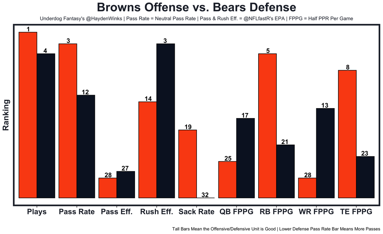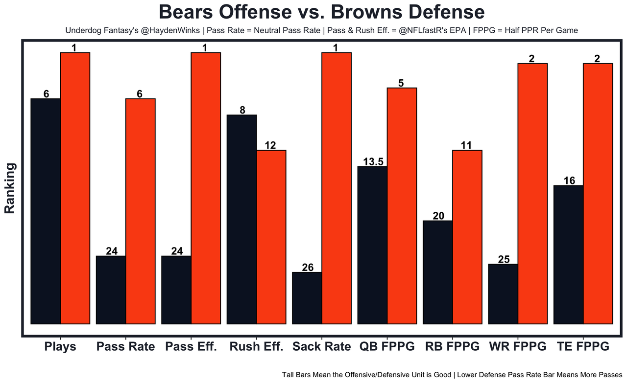 The Browns just placed CB Grant Delpit and DT Maurice Hurst on IR and are likely without S Juan Thornhill, EDGE Ogbo Okoronkwo, and DT Jordan Elliott, but star CB Denzel Ward (limited) could return and DPOY favorite Myles Garrett had a season-high 3 QB hits last week while playing through his own injury. This is a potentially scary spot for Fields, who is playing better ball right now, but can't afford to have a downgraded D.J. Moore (DNP).
