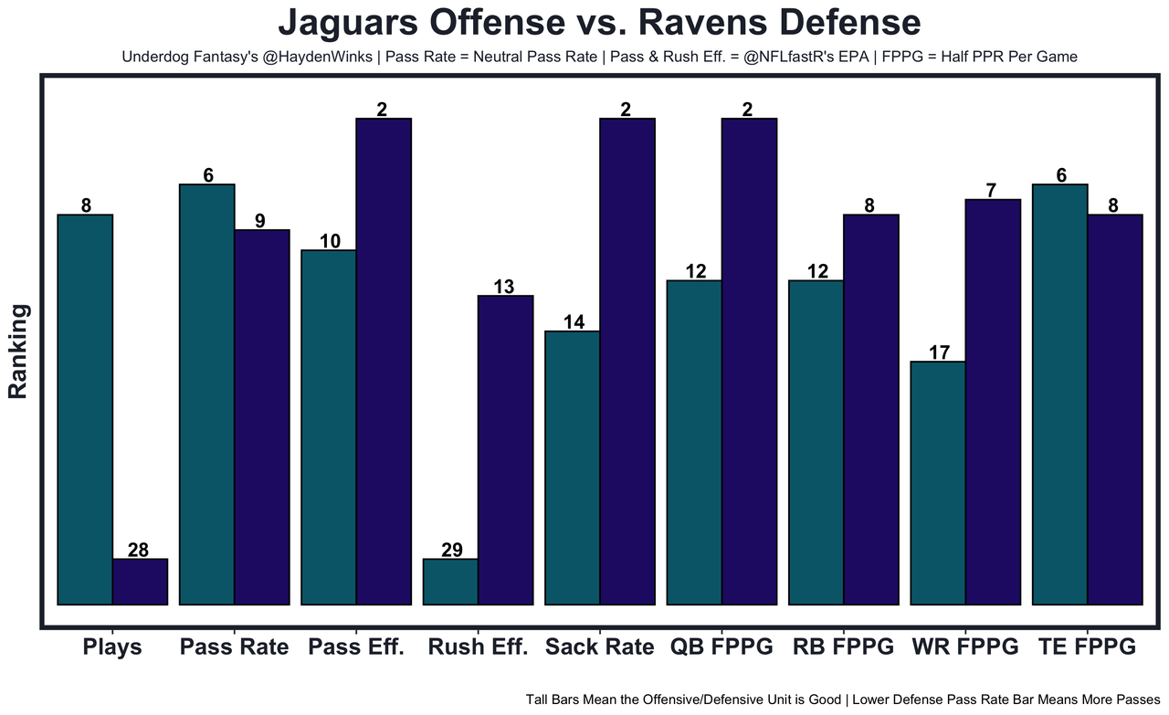 Travis Etienne - It's been an inconsistent season for Etienne and the Jaguars' ground game, but he's averaging 29.5 receiving yards per game. Those targets will be key with the Ravens' only allowing 5 RB TD all season long. A lower-than-normal team total (19.75 points) awaits Jacksonville on the road. 82.5 total yards in Pick'em.