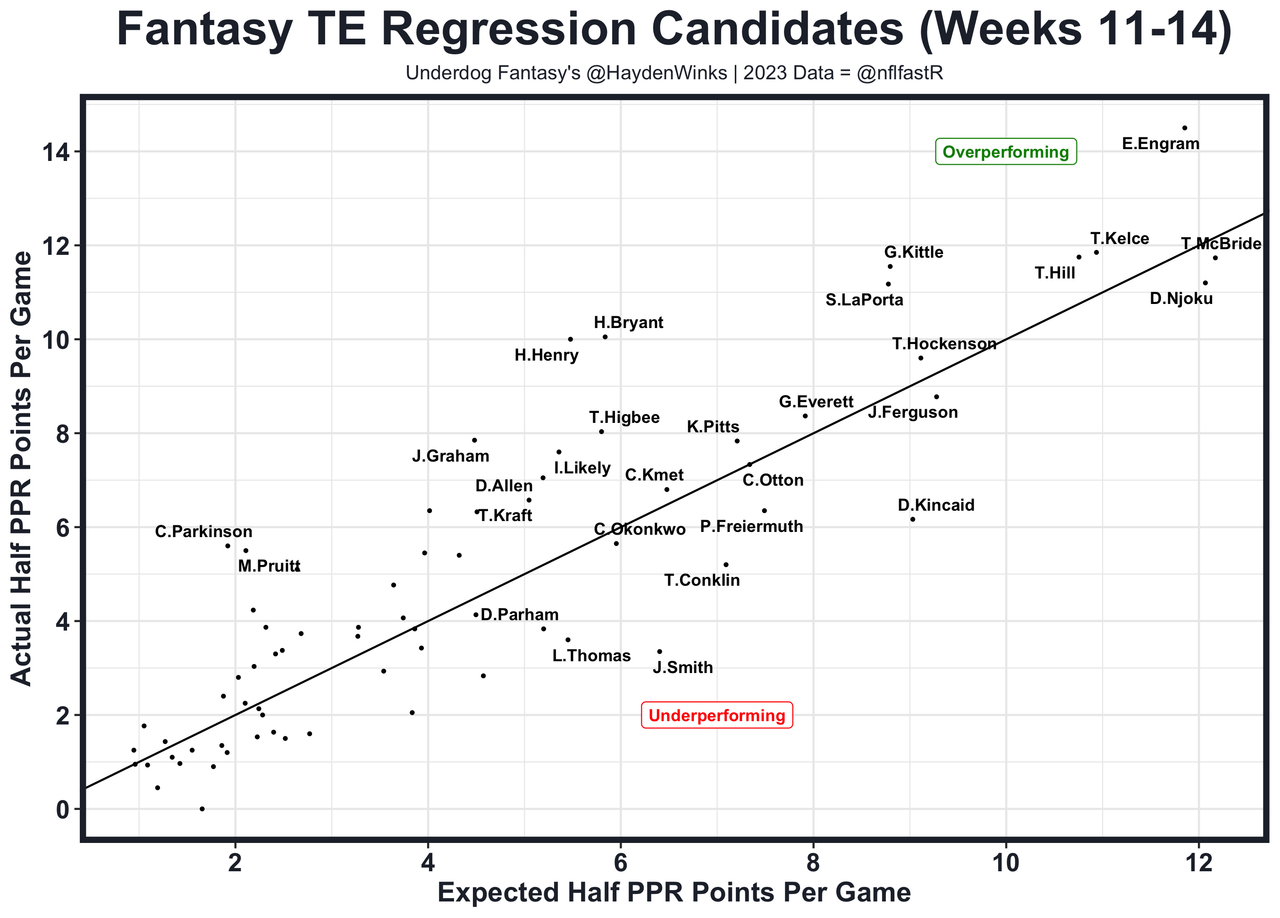 Tyler Conklin - Everyone is sleeping on Conklin's volume with the Jets passing more under Zach Wilson and with CJ Uzomah on IR. He's coming off 13.9 and 6.7 expected half PPR points. It helps the Jets are expected to lose by 8.5 points to the Dolphins, and perhaps the gusty winds force more checkdowns here.
