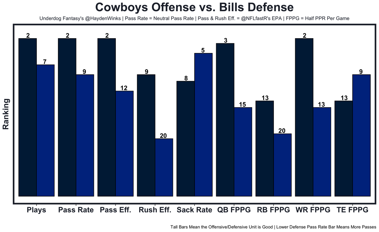 CeeDee Lamb - He's the WR1 overall in usage this month with the Cowboys 2nd in neutral pass rate and 2nd in WR fantasy usage. The Bills are 13th against fantasy WRs and could be without S Micah Hyde this week. Dallas vs. Buffalo has high shootout odds. 88.5 receiving yards in Pick'em.