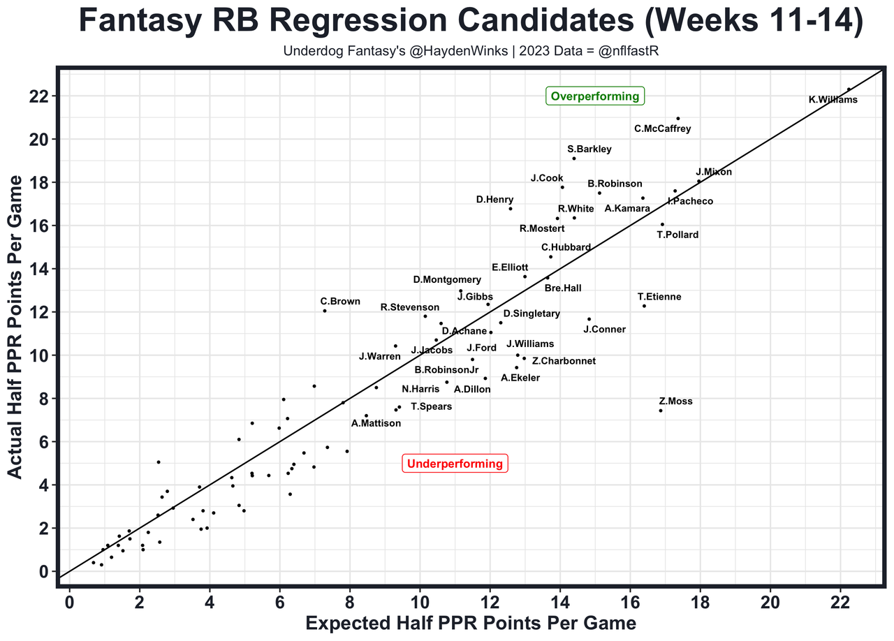 D'Onta Foreman - He was the clear starter in Week 14, seeing 8.9 expected half PPR points as the early-down rusher. Khalil Herbert is involved still, however, and the Bears only project for 16.75 points in Cleveland.