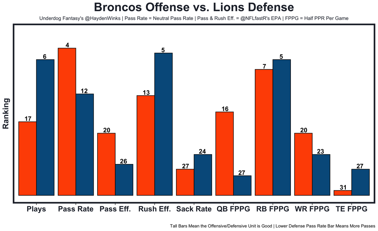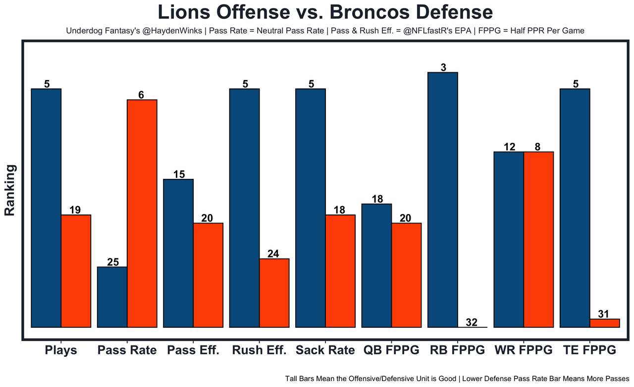 The Lions have OG Halapoulivaati Vaitai on IR, LT Taylor Decker (back) hasn't practiced this week, and C Frank Ragnow (limited) didn't play last week. That partially explains the Lions' flop in Chicago last week. Back at home, the Lions have a get-right spot with an improved Broncos defense, one that could be without starters LB Nik Bonitto and S P.J. Locke. They've been exposed over the middle all year.