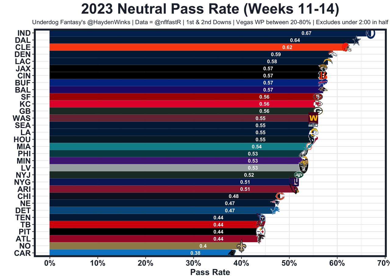 Chuba Hubbard - Carolina's offense has changed under new management. They're now 32nd in neutral pass rate (38%), while committing to more power runs on the backs of Hubbard and Miles Sanders. Hubbard is the RB21 on RB23 usage this month despite the offense scoring 6, 18, 10, and 10 points over that span. 60.5 rushing yards in Pick'em.