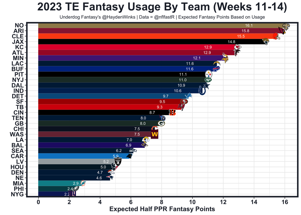 Cole Kmet - The Browns have allowed 38 receptions to TEs. The next closest, 47. Cleveland has allowed 357 yards to TEs. The next closest, 464. This is an elite fantasy TE defense, and the Bears have a 16.75-point team total, too. Kmet is the TE11 in usage this month.