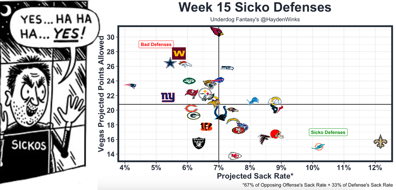 The fantasy football defenses of Week 15 are the Saints (vs. NYG), Dolphins (vs. NYJ), Browns (vs. CHI), Chiefs (at NE), Falcons (at CAR), 49ers (at ARI), Titans (vs. HOU), and Raiders (vs. LAC).