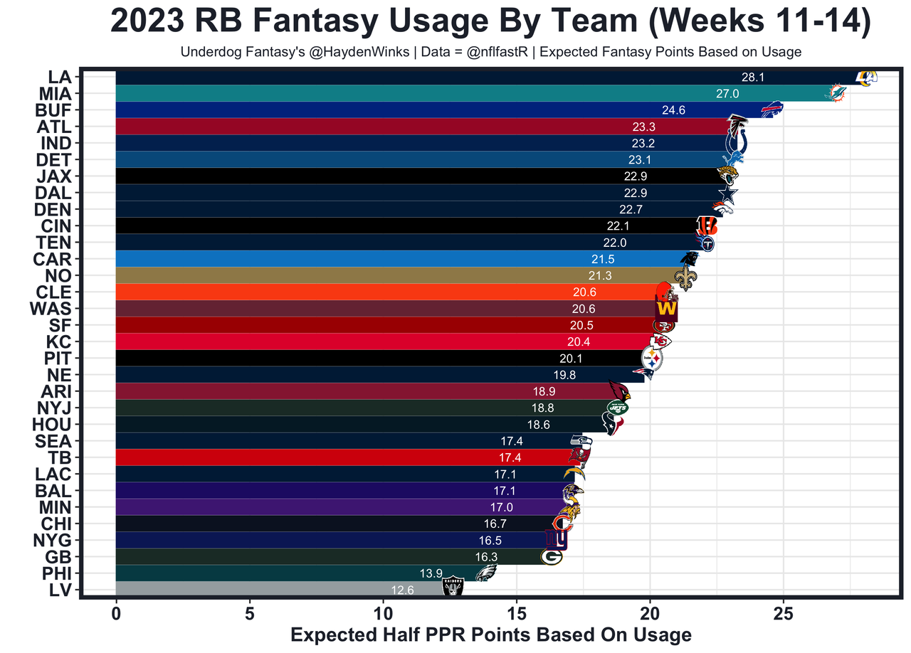 Antonio Gibson - After Brian Robinson (hamstring) left in Week 13, Gibson played 72% of the snaps en route to 10.5 expected half PPR points in negative script. Robinson was averaging 11.0 expected half PPR points as the starter this season, so similar to where Gibson finished as the fill-in. Gibson will be joined by inexperienced Day 3 rookie Chris Rodriguez (53 career snaps) in Week 15 when the Commanders project for a league-average 21.5 points against the Rams.