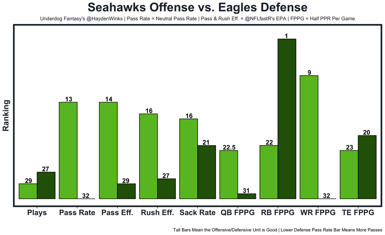 Seattle finally has both of their OTs back to full snaps, and this is a spot to sling the ball. The Eagles are swapping LB Nakobe Dean (IR) for recently signed LB Shaq Leonard up the middle, where they've been picked apart all year. Geno Smith (groin) seems unlikely to play.