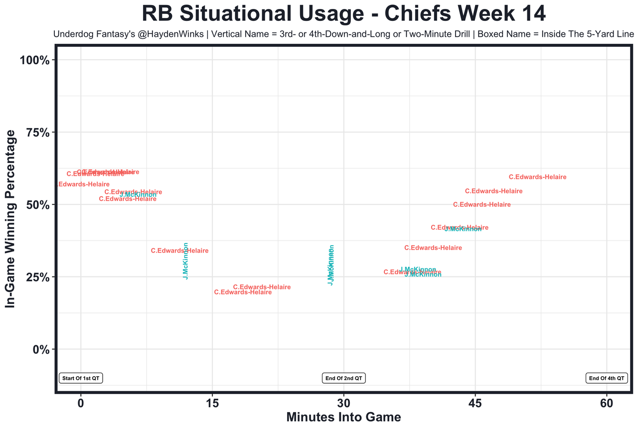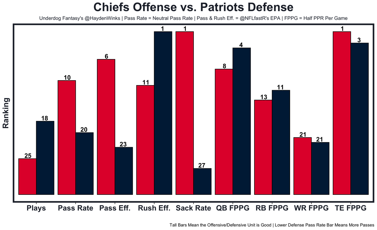 Clyde Edwards-Helaire - The Chiefs want him to win this job, especially on the ground. He played more snaps, saw more touches, and had more usage (8.8 expected half PPR points) than Jerick McKinnon (7.0), but it was McKinnon who scored the TD. It wasn't a goal line look, however, so it's still possible CEH can fall into the end zone while Isiah Pacheco (shoulder) misses time. This is a bad matchup for CEH against the Patriots, the best defense in both rushing EPA and rushing success rate allowed this season.