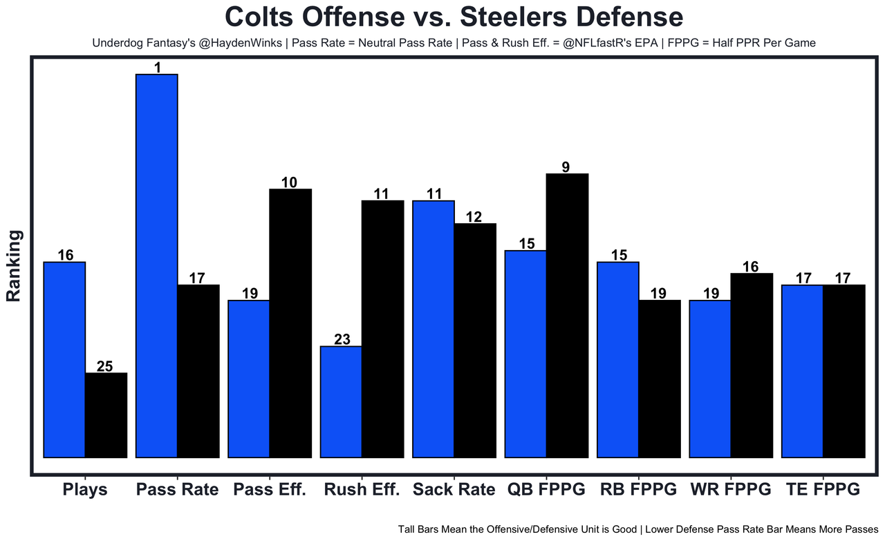 Michael Pittman - Up to the WR9 on WR3 usage this month, Pittman has RPO'd teams to death with Indy oddly up to 1st in neutral pass rate. It's possible Zack Moss's recent busts and their sliding defense are forcing underrated play-caller Shane Steichen to throw more than usual, even against the Steelers' borderline top-12 defense. Pittsburgh has allowed just two WRs to reach 12.0 half PPR points since Week 4. 74.5 receiving yards in Pick'em.