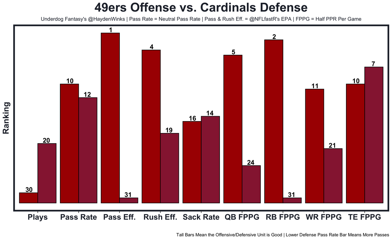 Brandon Aiyuk - The Cardinals are 31st in passing EPA allowed, and Aiyuk had 6-148-0 receiving line against them in Week 4. 66.5 receiving yards in Pick'em.