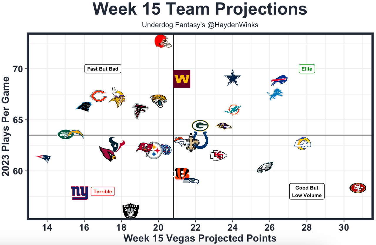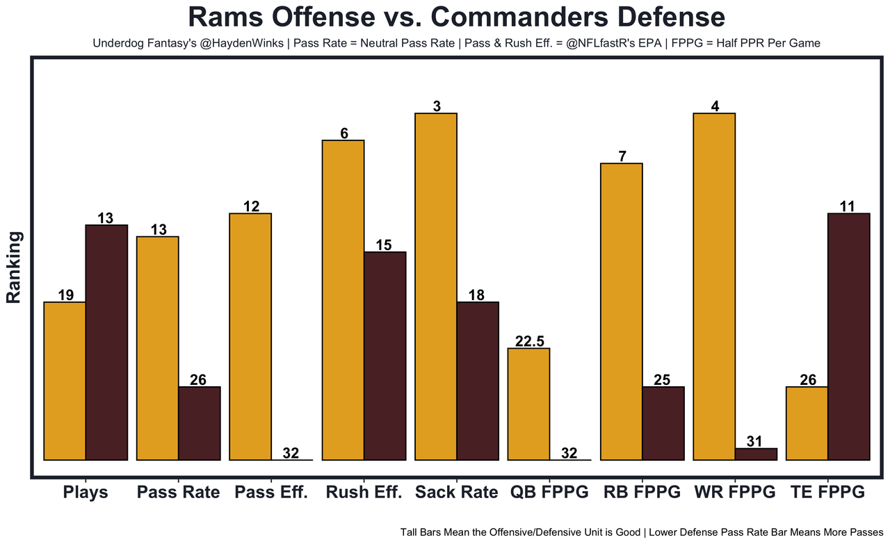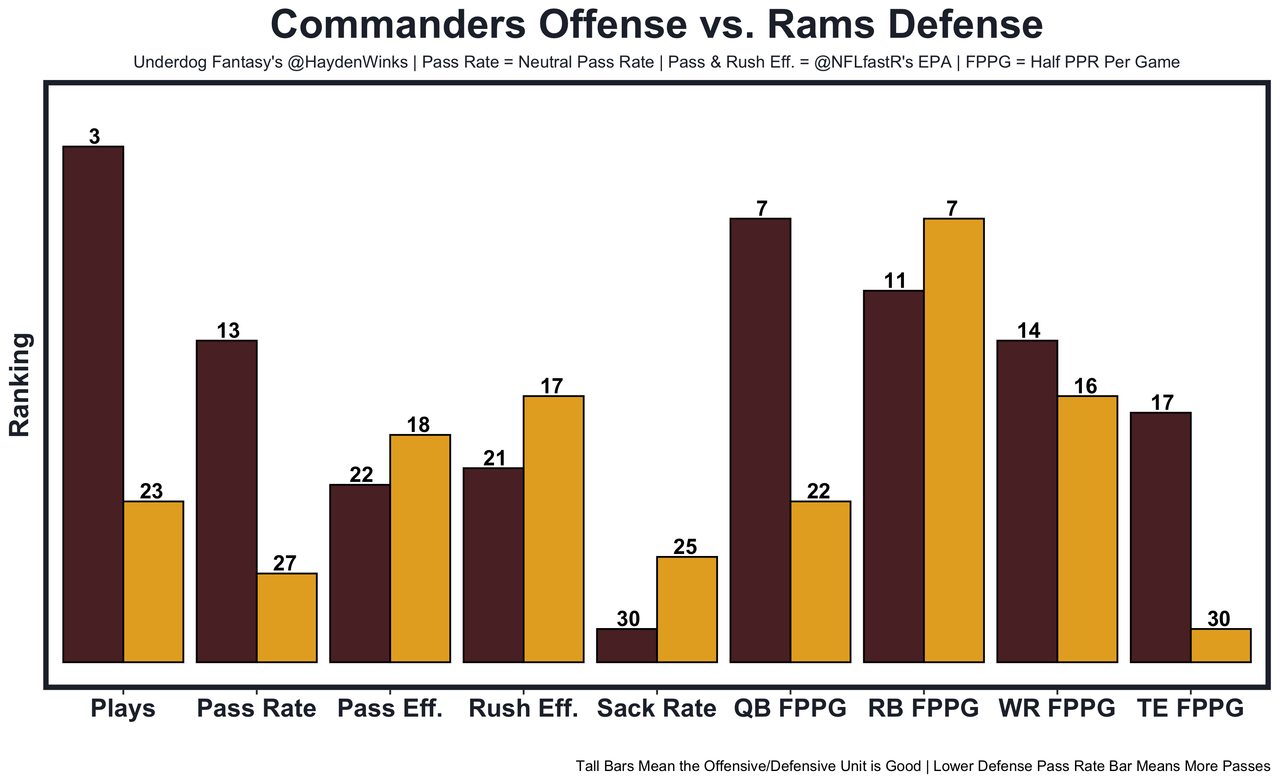 The Commanders are a total mess without EDGE Chase Young, EDGE Montez Sweat, and now LB Jamin Davis (IR). Stafford was a treat to watch last week, so it's no surprise the Rams have the 2nd-highest team total of the week.