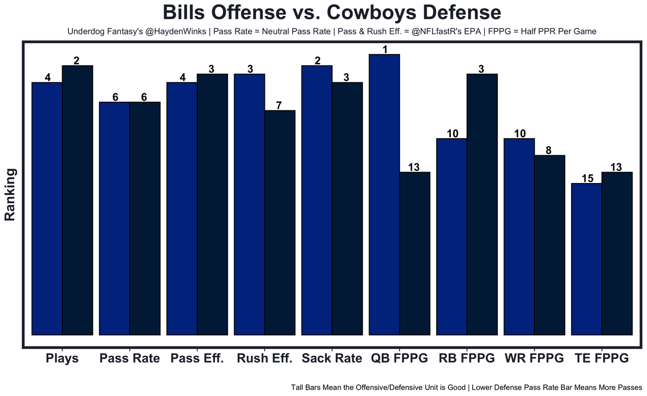 James Cook - Under OC Joe Brady, Cook is dominating. He's the RB6 on RB19 usage this month with more targets coming his way. The Bills have the 3rd-highest team total on the week, so the Cowboys would-be daunting matchup feels less daunting. Cook hasn't needed the goal line role to be an upside RB2. The increased target rate has him covered, and I wouldn't be surprised if getting the ball out underneath wasn't a Brady coaching point for Josh Allen. 81.5 total yards in Pick'em.