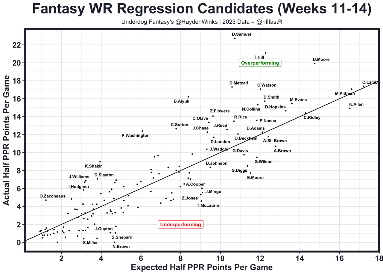 Jaylen Waddle - Tyreek Hill is out. Waddle is the WR28 on WR29 usage this month, and this matchup works against him in every way. CB Sauce Gardner, wind, injured OL, and a lower-than-normal Dolphins team total. That said, Waddle is always one YAC play away from crushing.