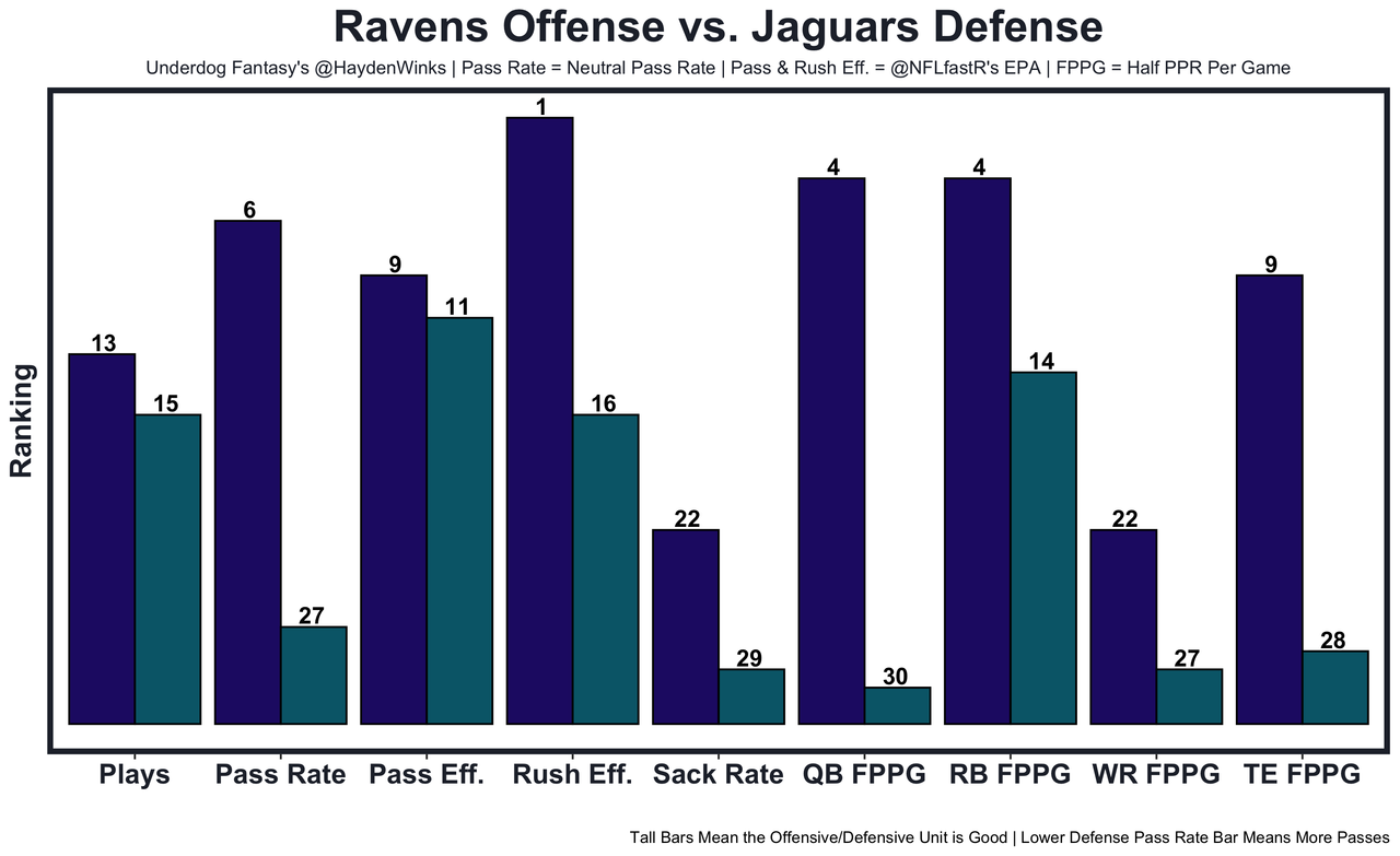 This is a pass funnel Jaguars defense missing underrated S Andre Cisco and CB Tyson Campbell, and the Ravens' skill group is narrowing. Zay Flowers and Odell Beckham are lapping Rashod Bateman (keep running on your post routes!) and Devin Duvernay is on IR. Isiah Likely is stepping in for Mark Andrews (IR). Keaton Mitchell has largely stolen Justice Hill's snaps, with Gus Edwards as the goal line back. That makes it easier to stack Lamar.