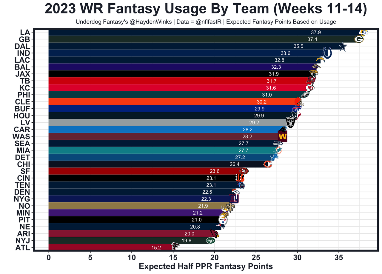 Every site has a fantasy football rankings column. None of them will be as charted up on a Thursday afternoon as this one. I'll go position-by-position with the charts, matchup notes, film, and injury nuggets that I view as worth your time. I also have my recap column where I have quick notes on the top 200 players' usage and film, in addition to their expected half PPR points based on their usage. Here is the data: