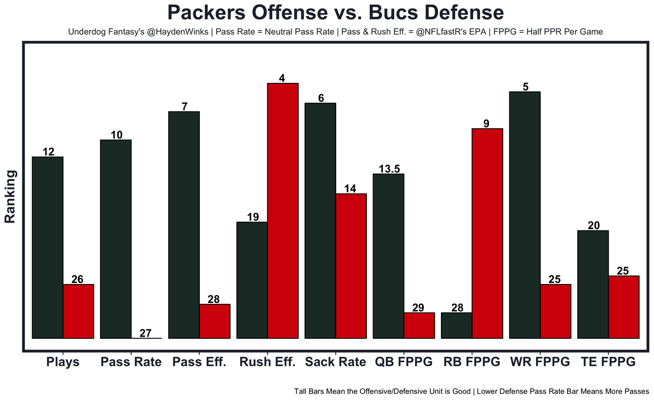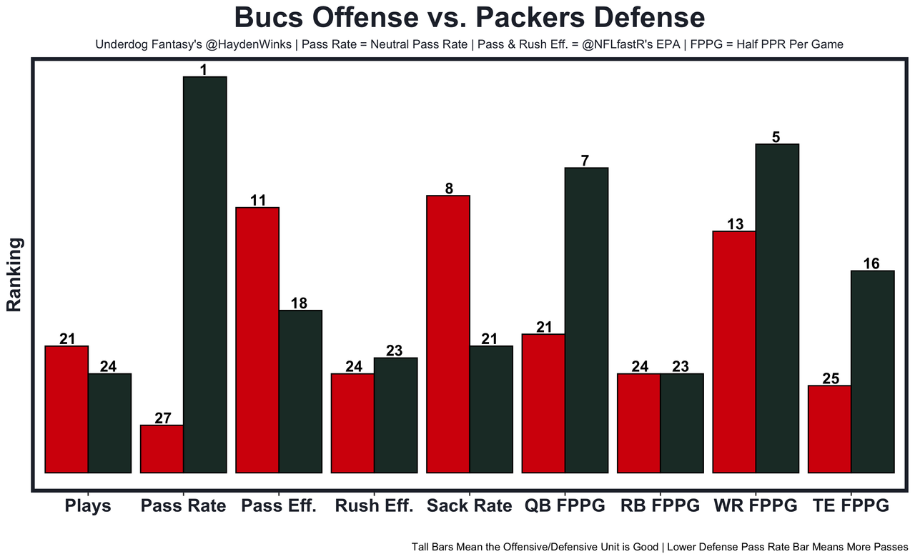 Mike Evans - He's the WR7 on WR6 usage this month, but this is a downgraded matchup in Green Bay. The Packers are 5th against fantasy WRs on the lowest neutral pass rate allowed. That said, Chris Godwin (knee) is on the injury report. 72.5 receiving yards in Pick'em.