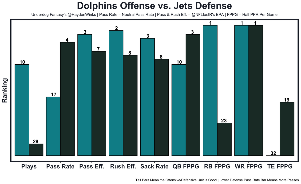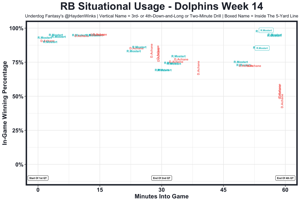 Raheem Mostert - The Dolphins view Mostert as the early-down 1a, while De'Von Achane is the manufactured home run threat and two-minute drill back. Mostert had 18.1 expected half PPR points in last week's close loss. Achane, 14.2. Both remain capable of a big play and a few receptions, but Mostert is the touch favorite for now. It's worth noting the Dolphins only project for 23.0 points this week against the Jets, the 4th-best rushing success rate unit. Apparently there could be heavy wind in this one. That at least would help.