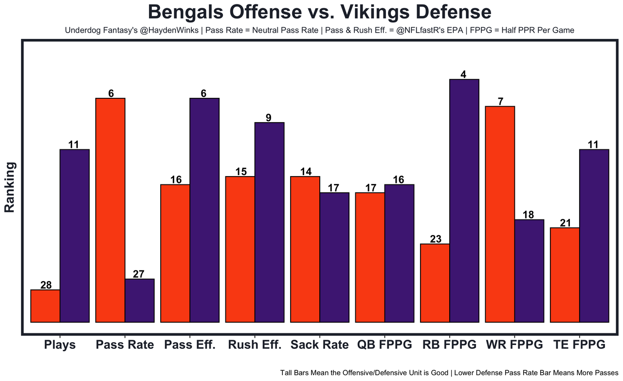 Joe Mixon - It's been a Linsanity run for the Bengals recently, but this is a tough task in Week 15. The Vikings are an inexperienced QB's worst nightmare thanks to DC Brian Flores, and opposing RBs have also had it bad. Minnesota is 4th-best against fantasy RBs with teams opting to pass against them at top-5 rates. Despite Mixon being the RB4 on RB3 usage this month, this is a fade spot. Rookie Chase Brown has been playing more since returning from injury. 90.5 total yards in Pick'em is something I'll explore lowers on.