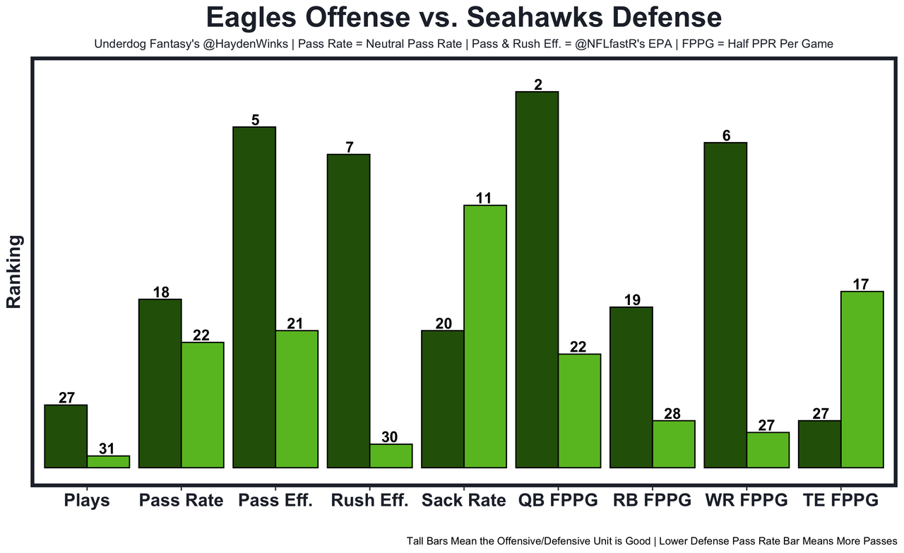D'Andre Swift - I've been lower on Swift recently -- he's the RB36 on RB35 usage this month -- but this is a decent spot for him. The Eagles are back to 25.75 projected points, and the Seahawks are 5th-worst against fantasy RBs. If Swift can be more disciplined hitting the hole, there are big plays waiting. LB Bobby Wagner and S Jamal Adams are struggling.