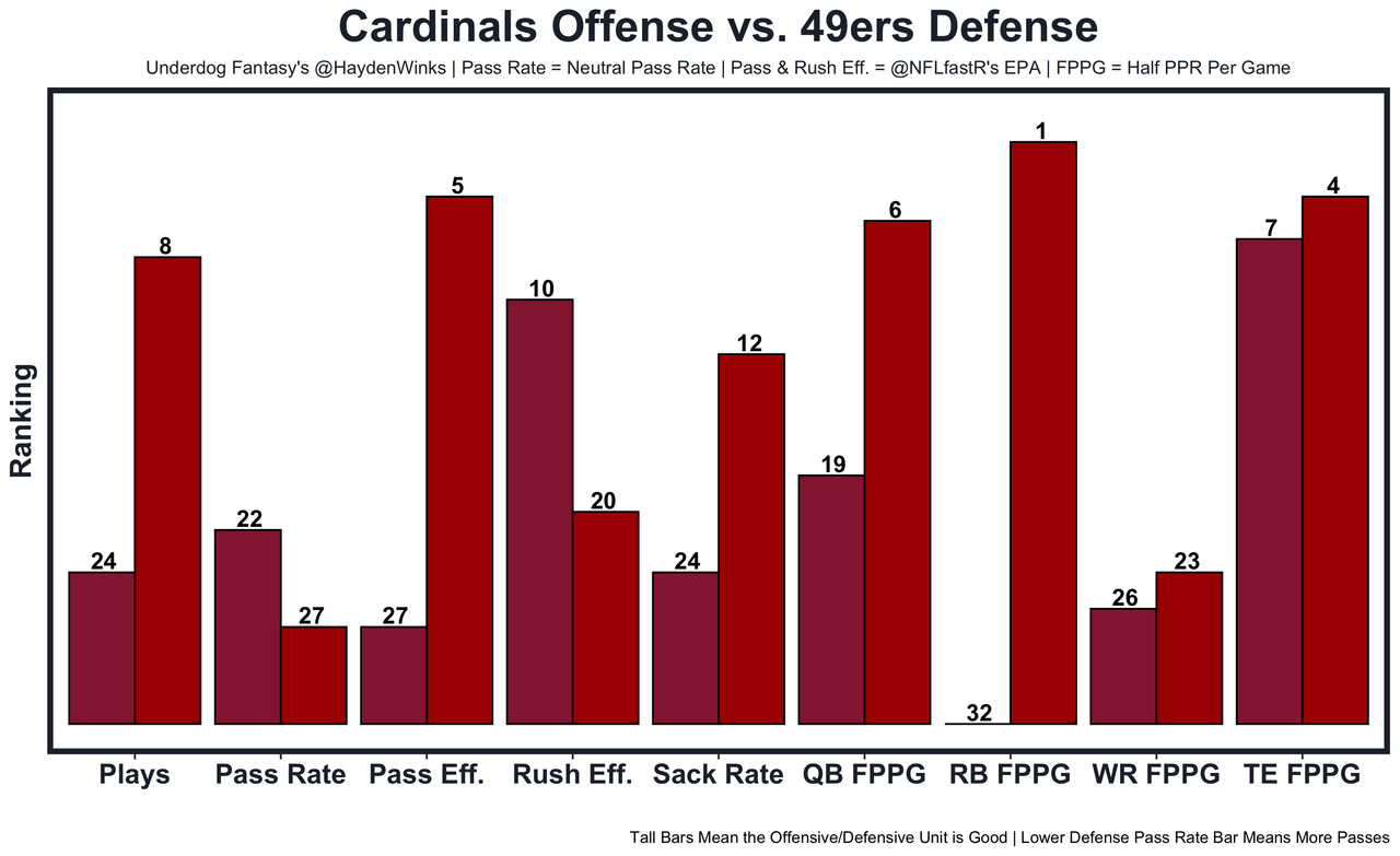 James Conner - Since playing with Kyler, Conner is averaging 10.6 half PPR points on 13.8 expected half PPR points as an upside RB3 in positive game script. One big issue: the 49ers are 13.5-point favorites as the league's best fantasy RB defense. 51.5 rushing yards in Pick'em.