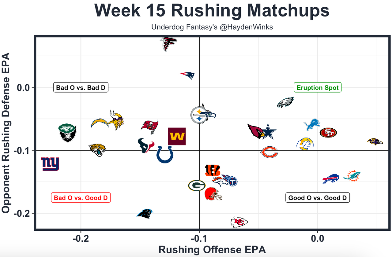 Kenneth Walker - In his last two healthy games, Walker has 14.3 and 9.9 expected half PPR points while losing real work to Post-Bye Rookie Bump Zach Charbonnet. Walker has to be a big play threat to be an RB2, and the odds are stacked against him in Week 15. The Eagles have allowed the 2nd-fewest TDs to RBs on the 4th-fewest carries.