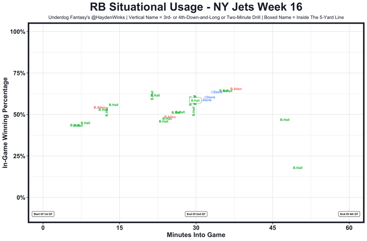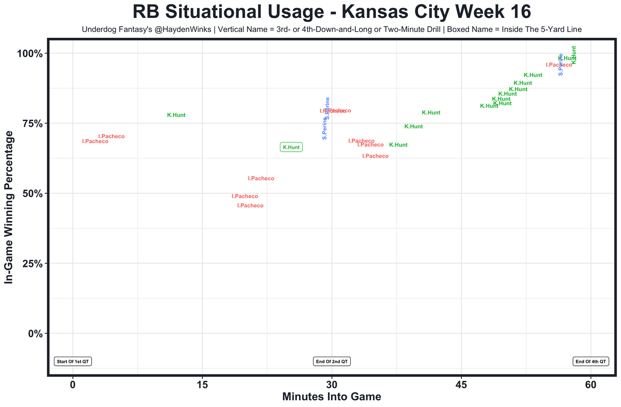 Since the Week 12 bye, here's what happened to the backfield. Travis Etienne led in usage in Week 13 (10.7 expected half PPR points. Then it was Bigsby (11.3). Then back to Etienne (13.9). And finally back to Bigsby last week (10.9). There is nothing hot about these hands.