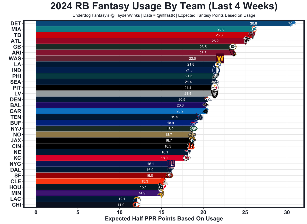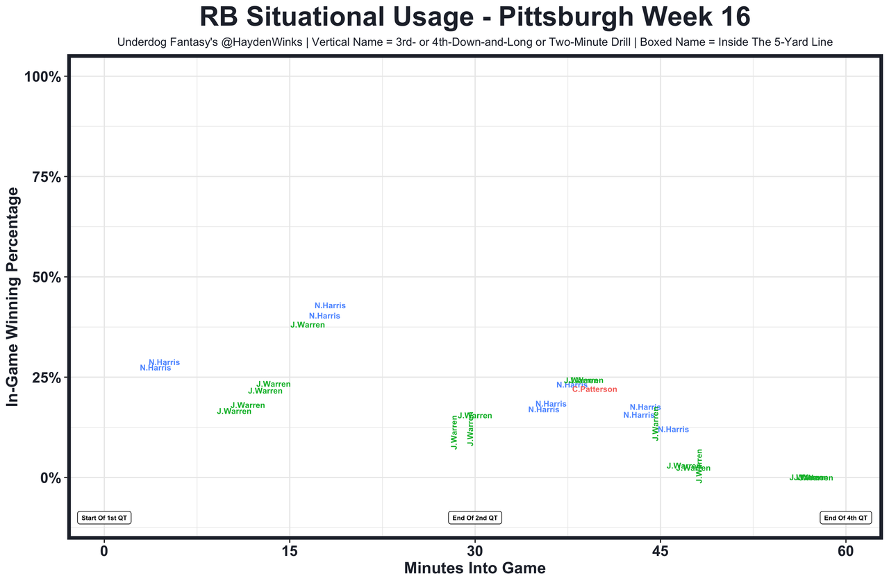 Last week was the 2nd time all season that Jaylen Warren finished with more usage (11.9 expected half PPR) than Najee (5.1, which was a season low). Game script can largely explain that, but Warren was in the mix early, too. Harris is the RB24 on RB26 usage this month with his usage tailing off.