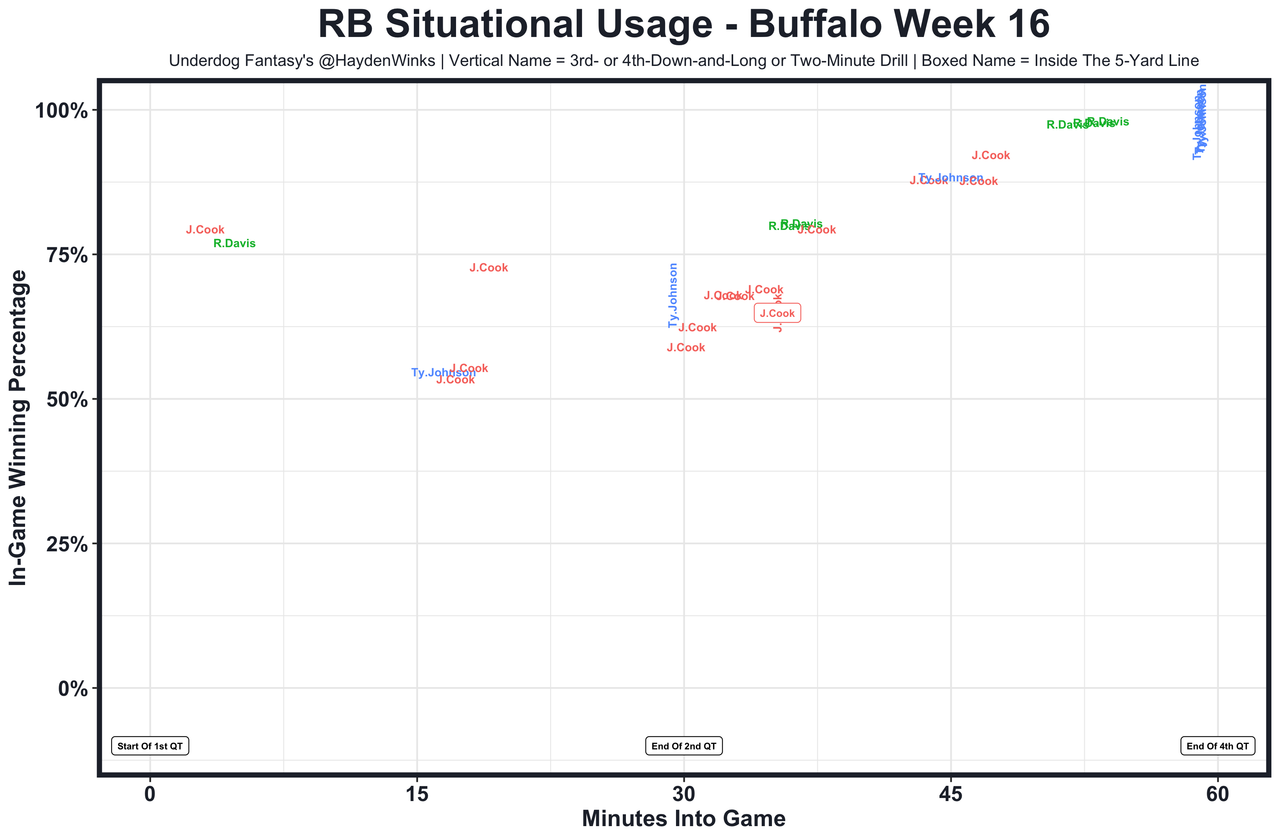 The Bills project for the most 2nd-points of the week, who are using more committee members than any team in the NFL. That includes 3 RBs well before garbage time. Cook is the RB7 on RB27 overall usage this month, as a negative regression candidate.
