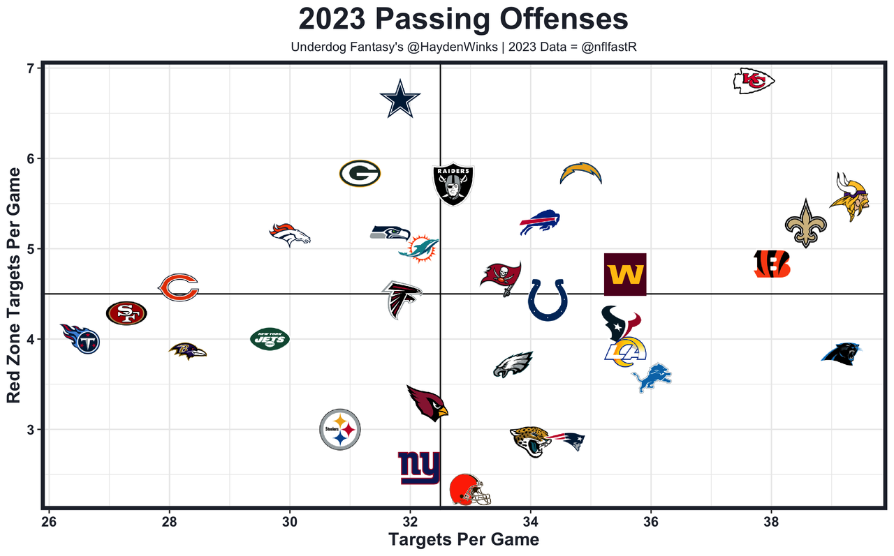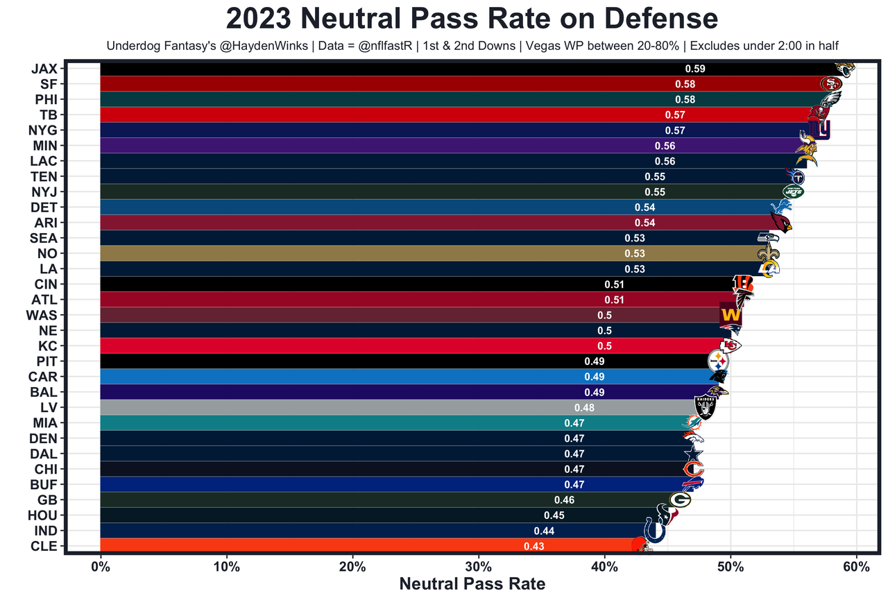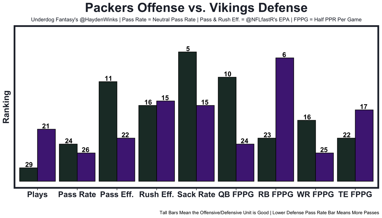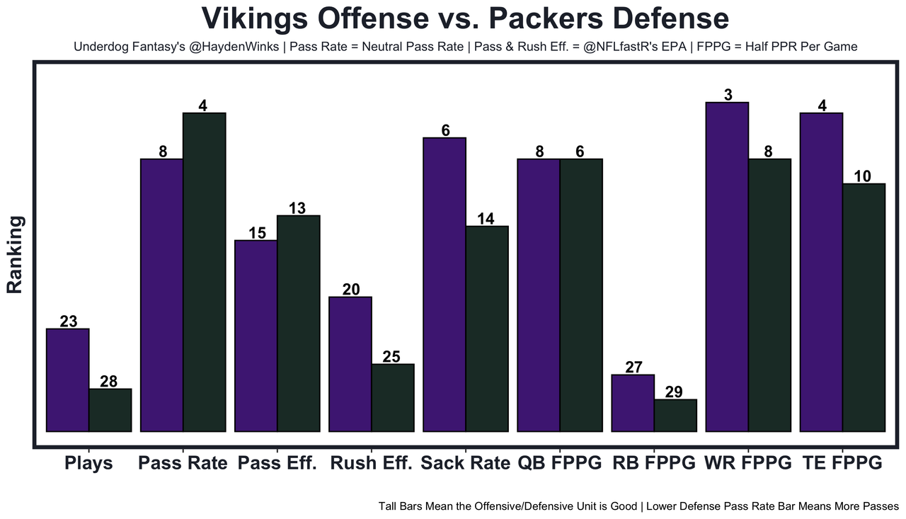 Offenses facing the Packers run the ball at the 4th-highest rate in neutral situations (because they can't stop the run), so we'll see if this pass-heavy offense leans into tendencies or not. Last season, the Vikings had 44% and 50% neutral pass rates against Green Bay, which is lower than their usual baseline. It'll be a challenge for Jordan Addison against CB1 Jaire Alexander, too. Even with Cousins being underrated by essentially everyone for years in a row, this is a challenging spot for fantasy production.