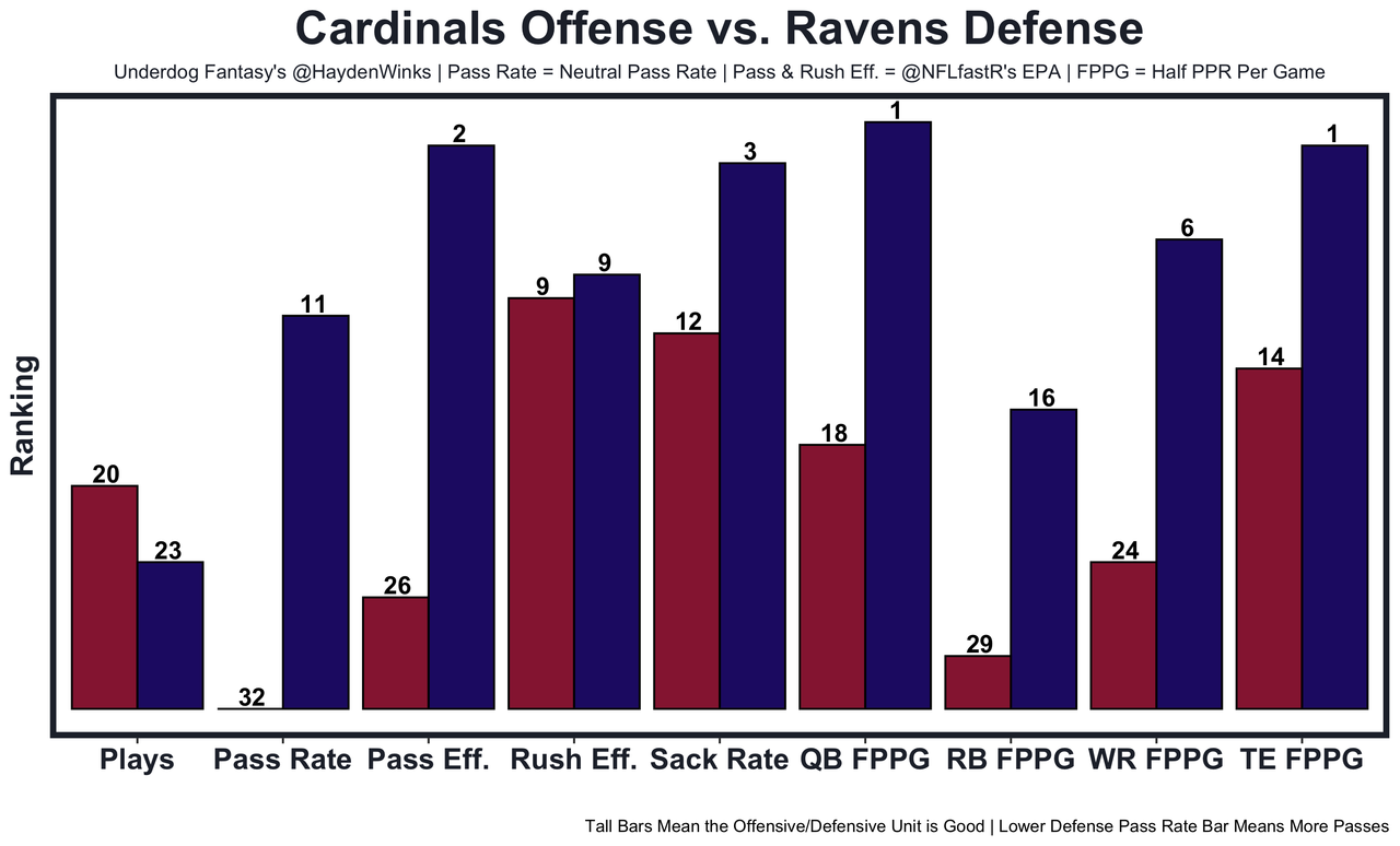 Gus Edwards - He's the RB26 on RB26 usage over the last month, including last week's career-high game thanks to a goal line score and a fluky 80-yard reception on a busted play. The Bus is best driven in positive game scripts, and Baltimore is 8.5-point favorites over the Cardinals, who are 3rd worst against fantasy RBs while allowing the 2nd-most carries. 9.55 half PPR in Pick'em.