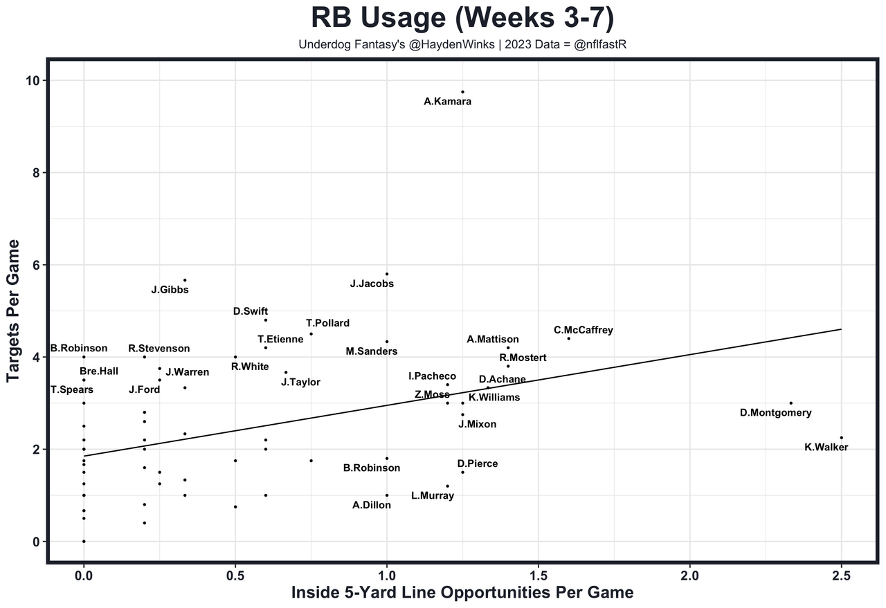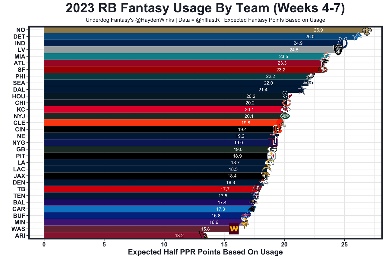 Every site has a fantasy football rankings column. None of them will be as charted up on a Thursday afternoon as this one. I'll go position-by-position with the charts, matchup notes, film, and injury nuggets that I view as worth your time. I also have my recap column where I have quick notes on the top 200 players' usage and film, in addition to their expected half PPR points based on their usage. Here is the data: