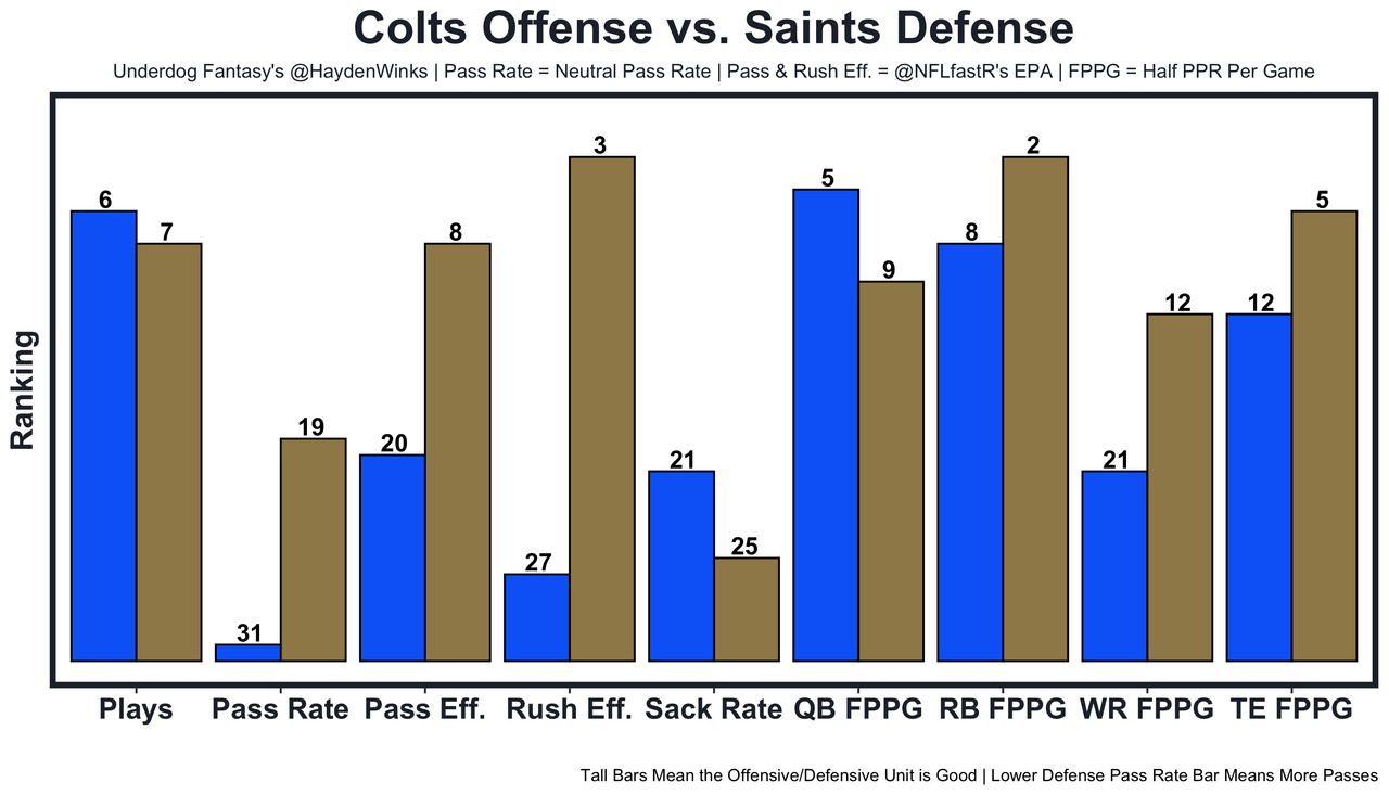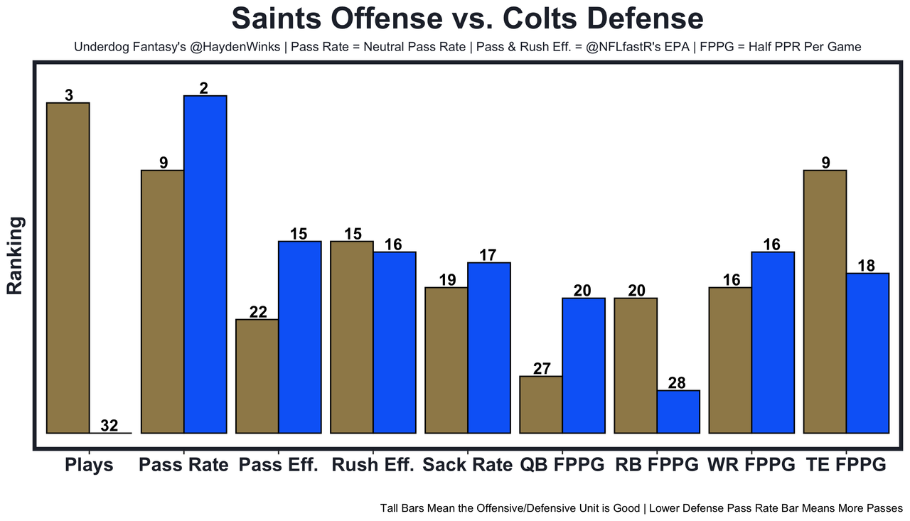 Alvin Kamara - Derek Carr's check downs are breaking all my charts and models. Enough already... But I don't see this tactic completely changing, especially against a Colts defense that's 5th worst against fantasy RBs (10 TDs allowed). 93.5 total yards in Pick'em.