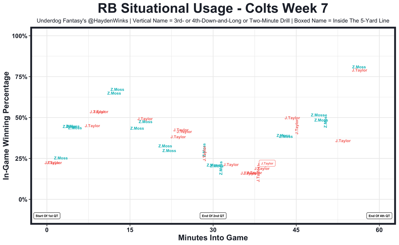 Jonathan Taylor - The backfield was split 50% in terms of snaps last week, with Taylor seeing a season-high 18.5 expected half PPR points to Moss's 10.0. In a fast-paced offense with a check-down capable QB, Taylor has breakout potential every week, especially if Moss (DNP-limited-DNP) misses. Initial reports were Taylor would need a month to get back to full speed. We're there now, and it comes at a good time with Moss very questionable. The Colts have an above-average 22.5-point team total at home.