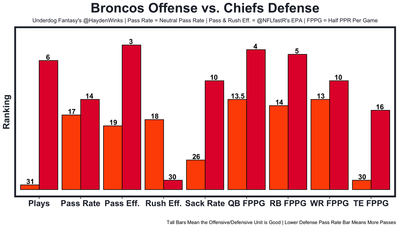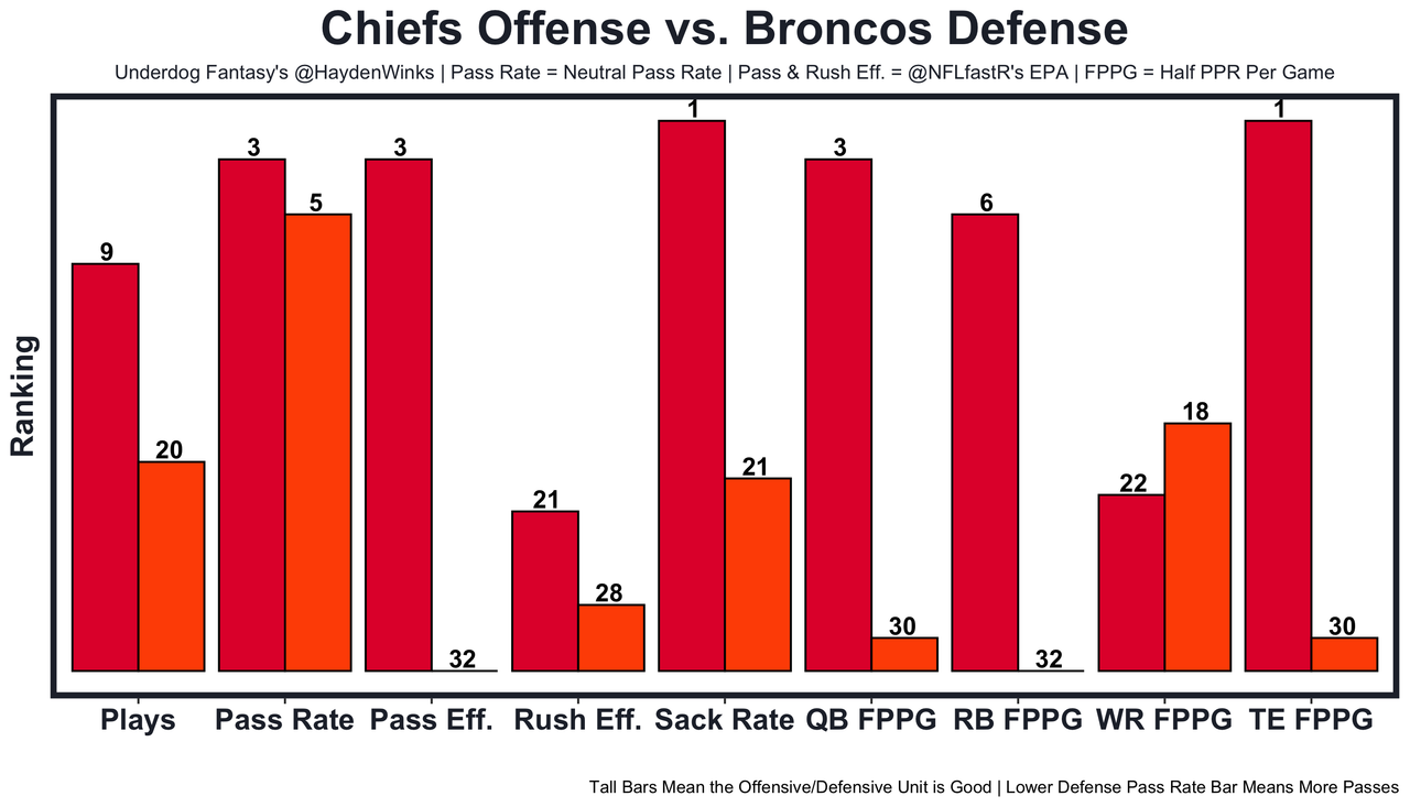 Rashee Rice - He ran a route on 65% of dropbacks last week without Justin Watson (full x2), which is enough to get him on the flex radar here. This is a full-blown eruption spot for the passing offense, and Rice is the only young receiver winning on real routes. He'll also dodge CB1 Patrick Surtain by moving in the slot on 59% of his snaps. Denver's CB2 Damarri Mathis is the 2nd worst in PFF coverage grade. 41.5 receiving yards in Pick'em.