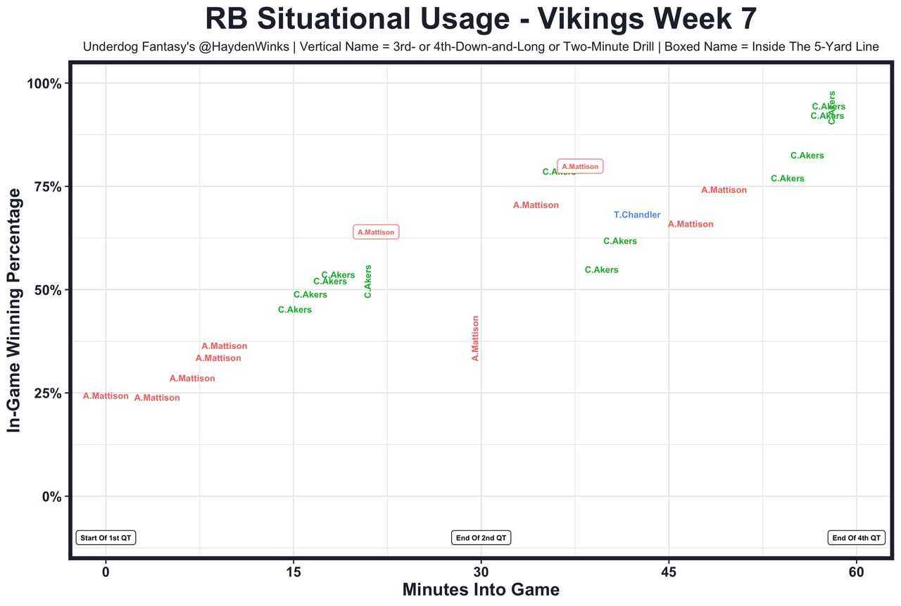 Alexander Mattison - It's a week-by-week proposition between Mattison (52% Week 7 snaps) and Cam Akers (39%), and there's just not enough volume to make it work with confidence. Minnesota is 5th in neutral pass rate and 1st in pass rate inside the 10-yard line, so Mattison needs to convert his goal line opportunities at a high clip (which I wouldn't hold my breath on). Over the last month, Mattison is the RB30 on RB22 usage. 64.5 total yards in Pick'em.