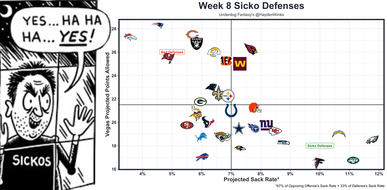 The fantasy football defenses of Week 8 are the Jets (@ NYG), Eagles (@ WAS), Falcons (@ TEN), Chargers (vs. CHI), Seahawks (vs. CLE), Ravens (@ ARI), Bills (vs. TB), and Chiefs (@ DEN).