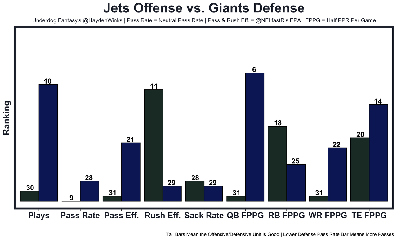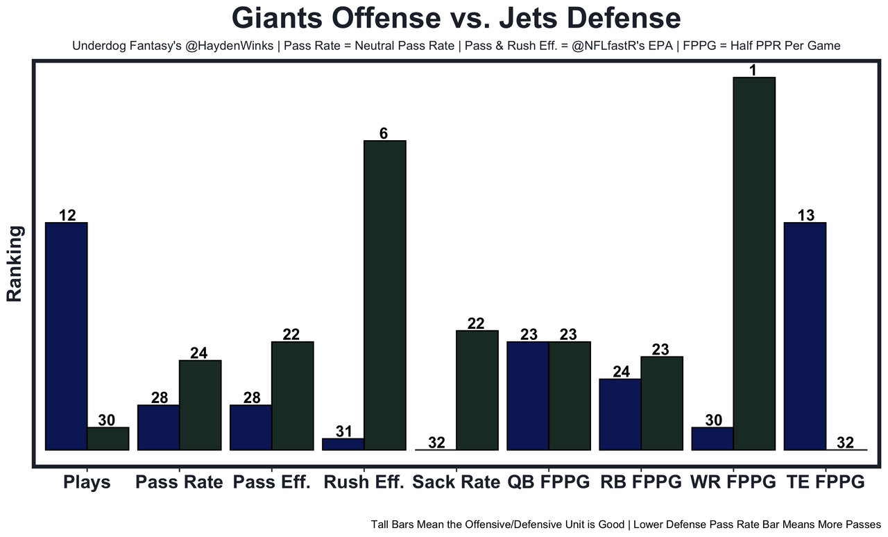 Breece Hall - He's had 19.1 and 13.1 expected half PPR points since being unlocked by the coaching staff. An injured OL and Zach Wilson's individual floor remain hurdles, but Breece is balling still and the Jets are at least projected for 19.5 points against the lowly Giants who are 8th-worst against fantasy RBs on 5.0 YPC. 96.5 total yards in Pick'em.
