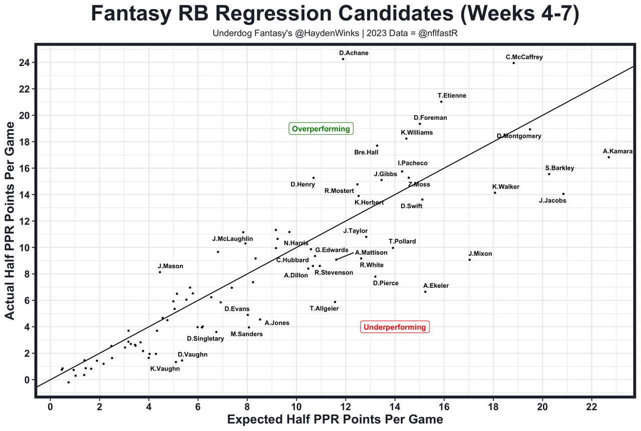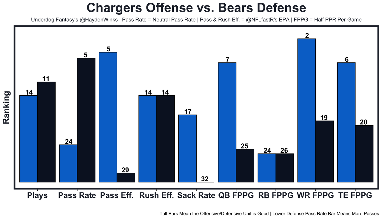 Austin Ekeler - Since his return, the Chargers have played their worst ball with Big Mike (IR), C Corey Linsley (IR), and Justin Herbert (finger) injured. Ekeler also picked up a low-grade ankle sprain on his other ankle last week (10.5 expected half PPR points), which is why Joshua Kelley played more than usual. We'll monitor injury reports this week, but the good news is the Bears are on deck. Los Angeles has the 2nd-highest team total of the week.