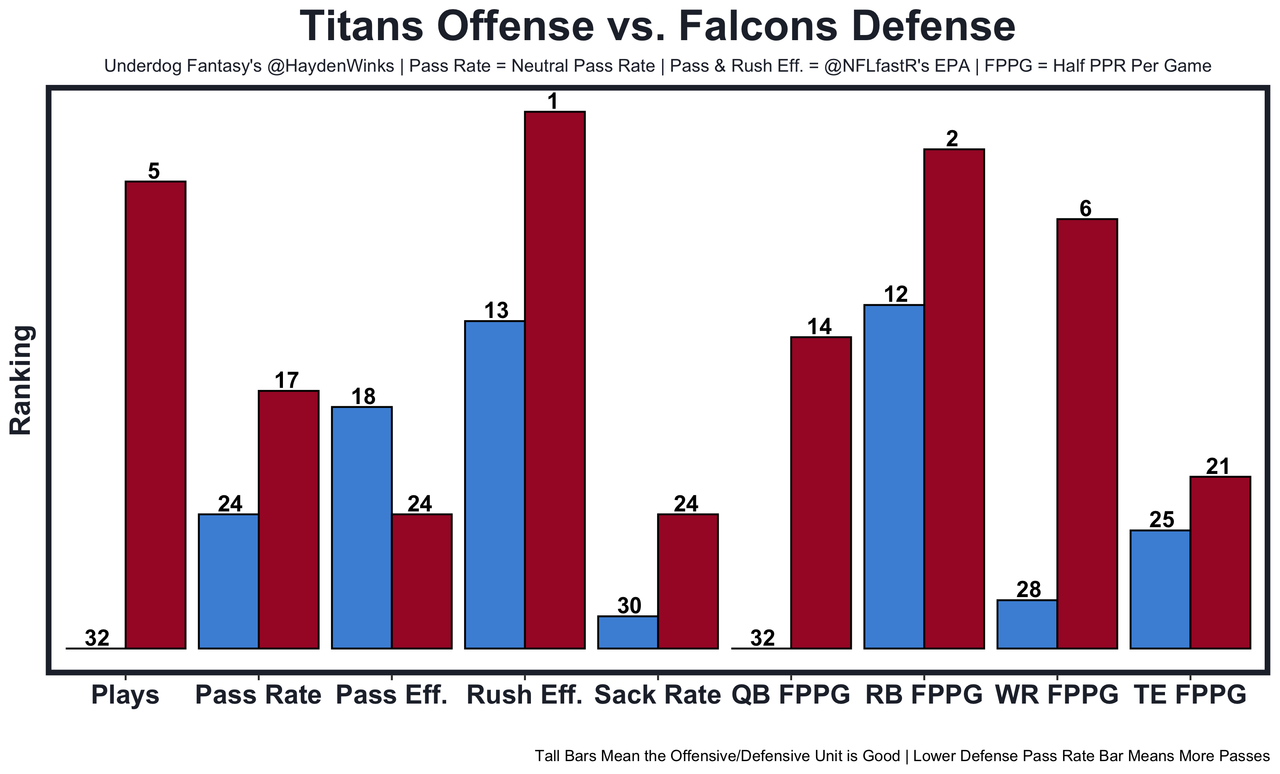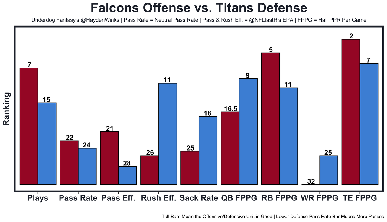 Kyle Pitts - 29% of his targets have been "contested" per PFF, the highest among TEs. It's what happens when a TE is treated as a WR, and Pitts is exactly that. His 11.4 average depth of target is by far the highest of the position, so he's more boom-bust by default (not to mention Ridder's inaccuracies). That said, Pitts is the TE7 in routes and TE8 in expected half PPR points, with the talent to break off long scores. It helps that the Falcons face the pass-funnel Titans, who just traded stud S Kevin Byard this week. 33.5 receiving yards in Pick'em.