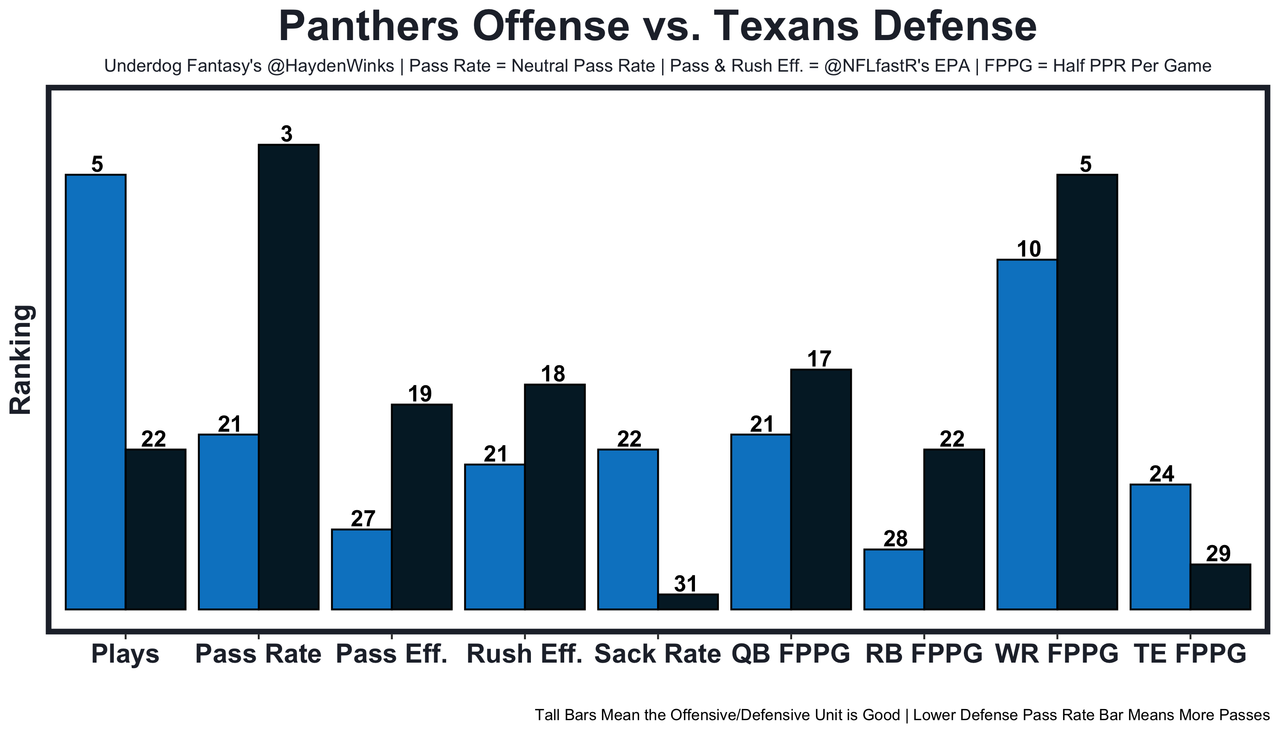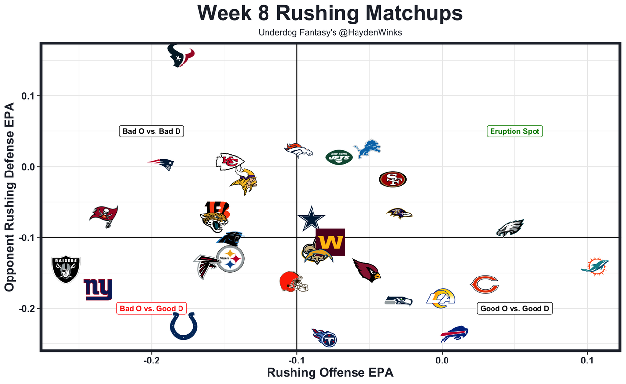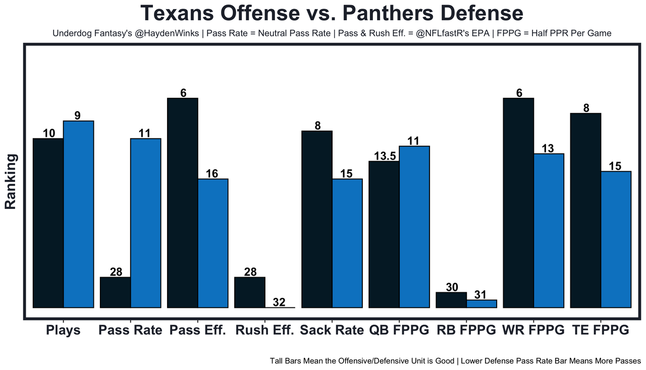 Dameon Pierce - A potentially beneficiary of a Post Bye Rookie Bump from CJ Stroud and company, Pierce will battle Devin Singletary for touches after losing snaps to him in Week 6. Pierce still had 12.3 expected half PPR points in that one (extending his streak to 5 games of 11.4 or more), but he's struggled behind an injured OL interior. The Texans project for a season-high 23.0 points as home favorites to the Panthers, who are allowing an absurd and league-high +0.16 EPA per carry. Positive game script would solve most of Pierce's fantasy issues to date. 64.5 total yards in Pick'em.