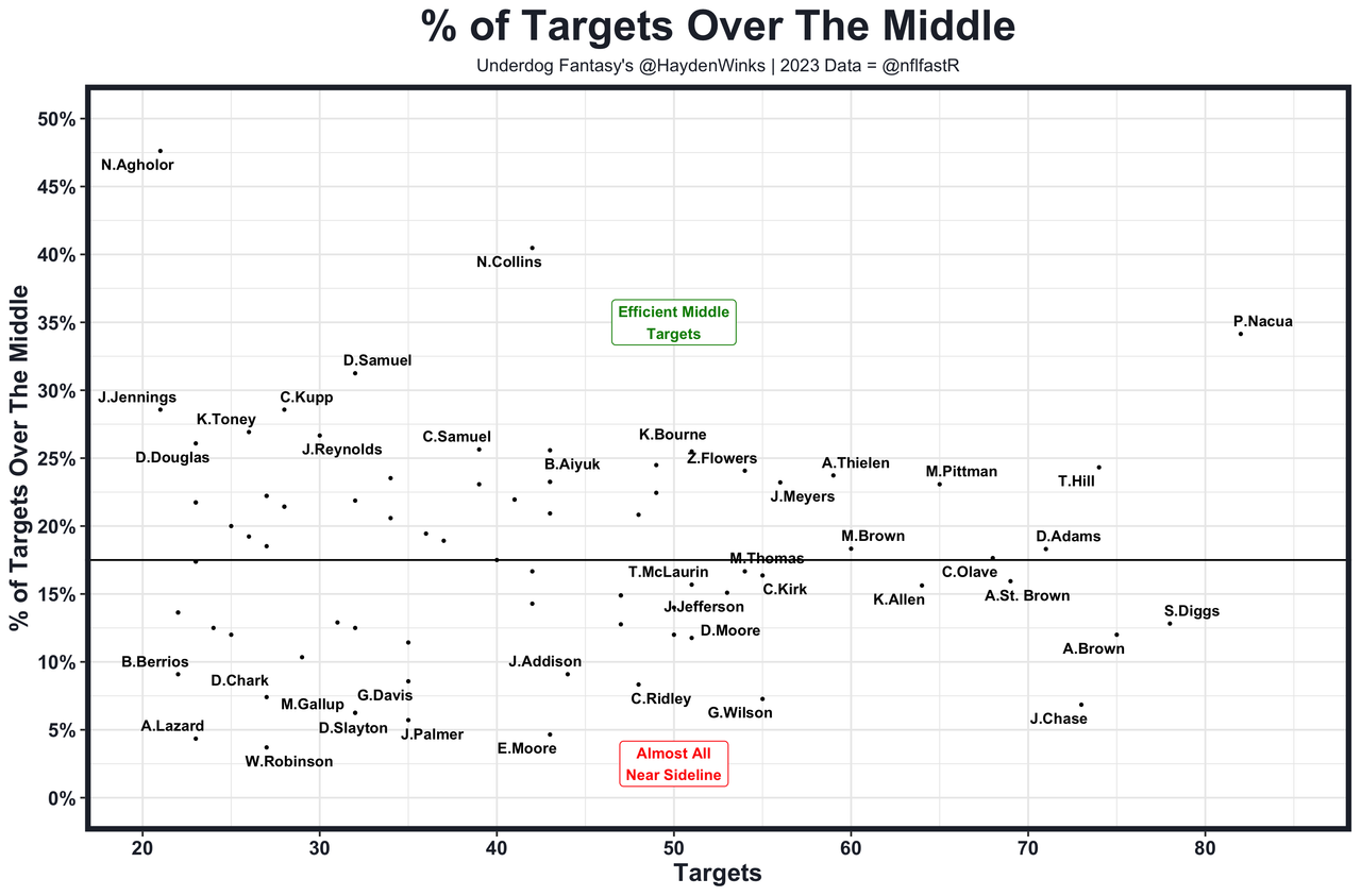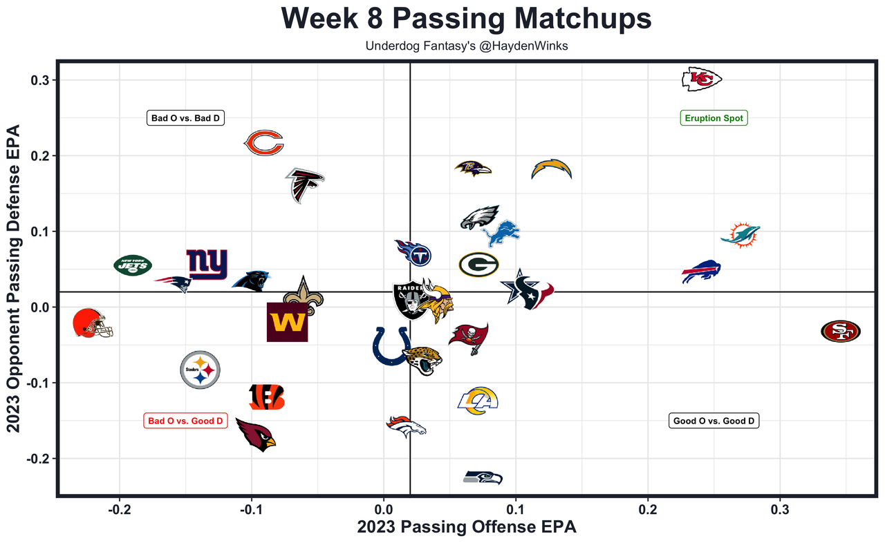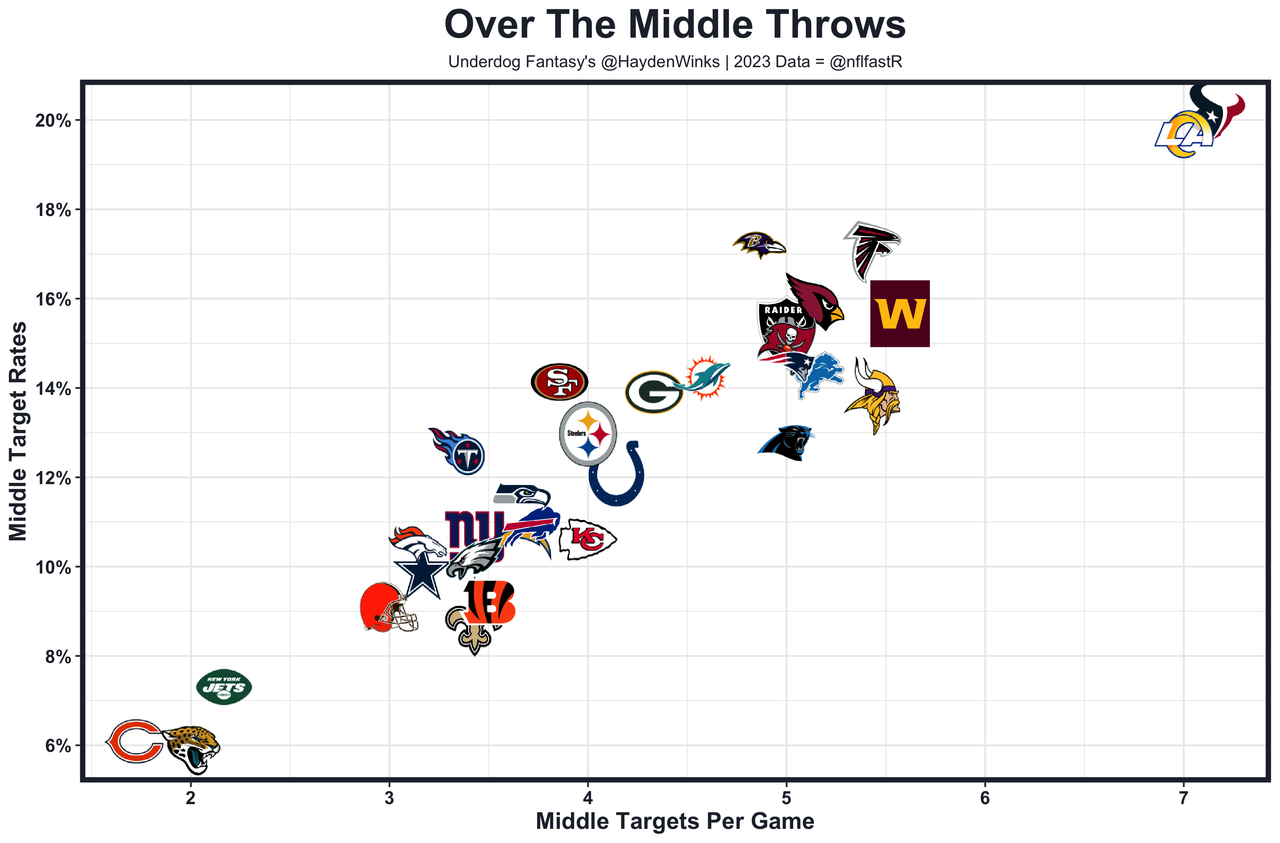Stroud is the QB4 in yards per attempt coming out of his Post Bye Rookie Bump, and he now has both of his starting OTs at full health. If the Texans can improve on their No. 27 red zone conversion rate, Stroud can enter the QB1 discussion long term because their between-20s passing offense is rock solid. In fact, they're 6th in passing EPA including the red zone woes. New OC Bobby Slowic is dialing up highly-efficient deep middle pass attempts at the league's highest rate, and that's only possible because Stroud is seeing the field well and has the arm talent to find spots. It's similar to 90% Matthew Stafford stuff right now. I'm very impressed.