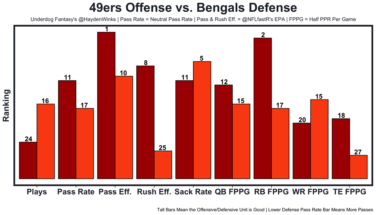 It's at least a good sign both Burrow and Tee Higgins were completely left off the injury report coming off the bye, and there was a report that Burrow was able to work under center in practice. That'd open up a new part of the playbook. Burrow will need everything he can get against the 49ers No. 3 fantasy QB defense. Cincy has an average-at-best 20.25-point team total.