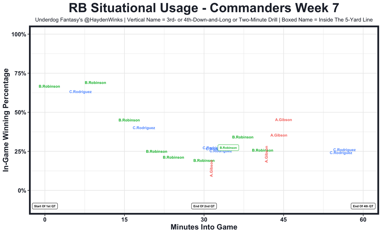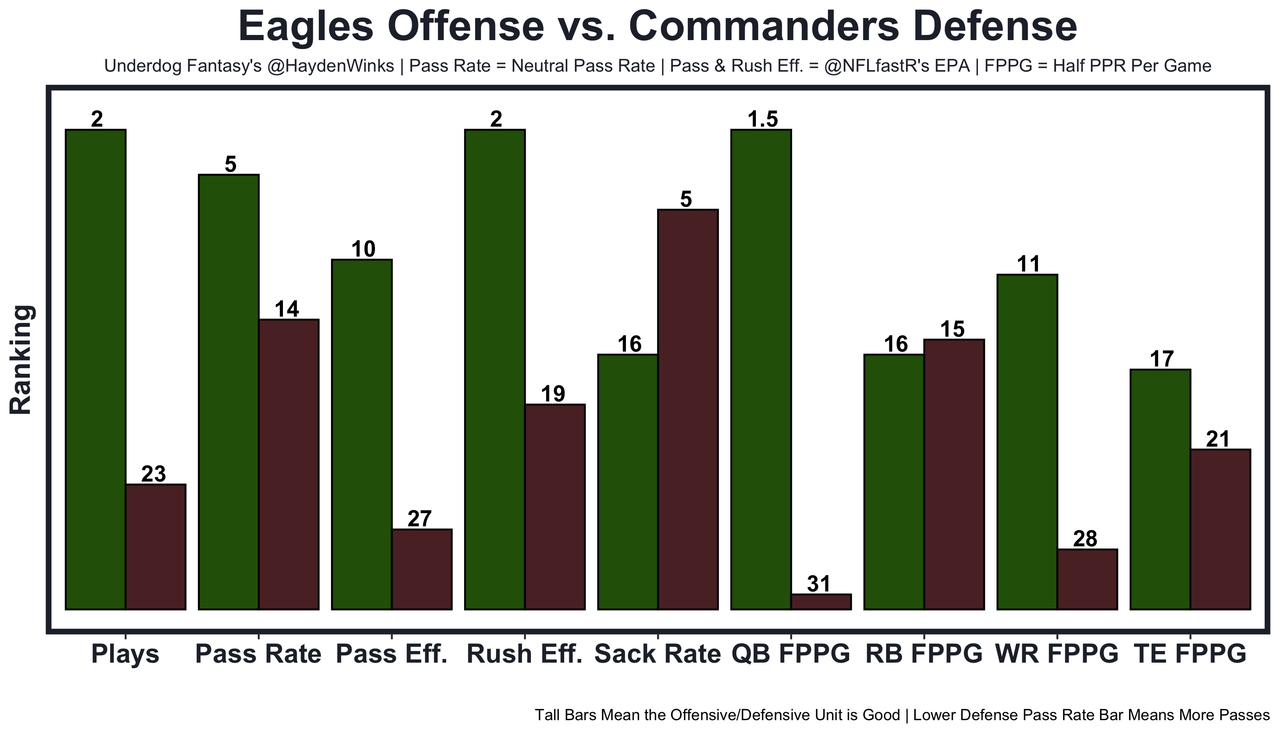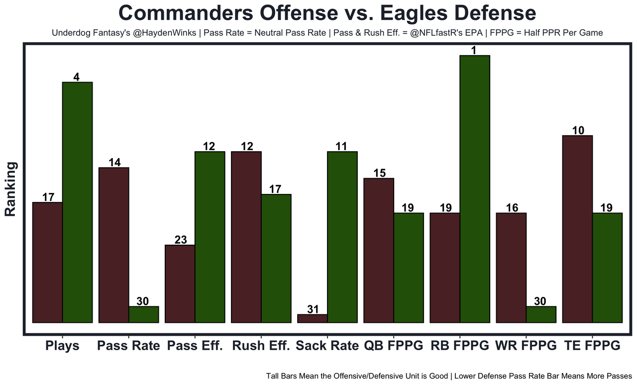 Brian Robinson - He remains the goal line back, but the Commanders introducing rookie Chris Rodriguez into this committee is a bad, bad sign for Robinson, who is down to RB31 usage over the last month. It'll be difficult for Robinson to find the positive game script he needs against the Eagles. Philly has allowed just 50 rushing yards per game to RBs. That's almost impossible to do.