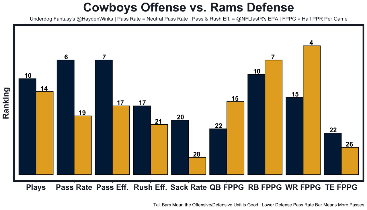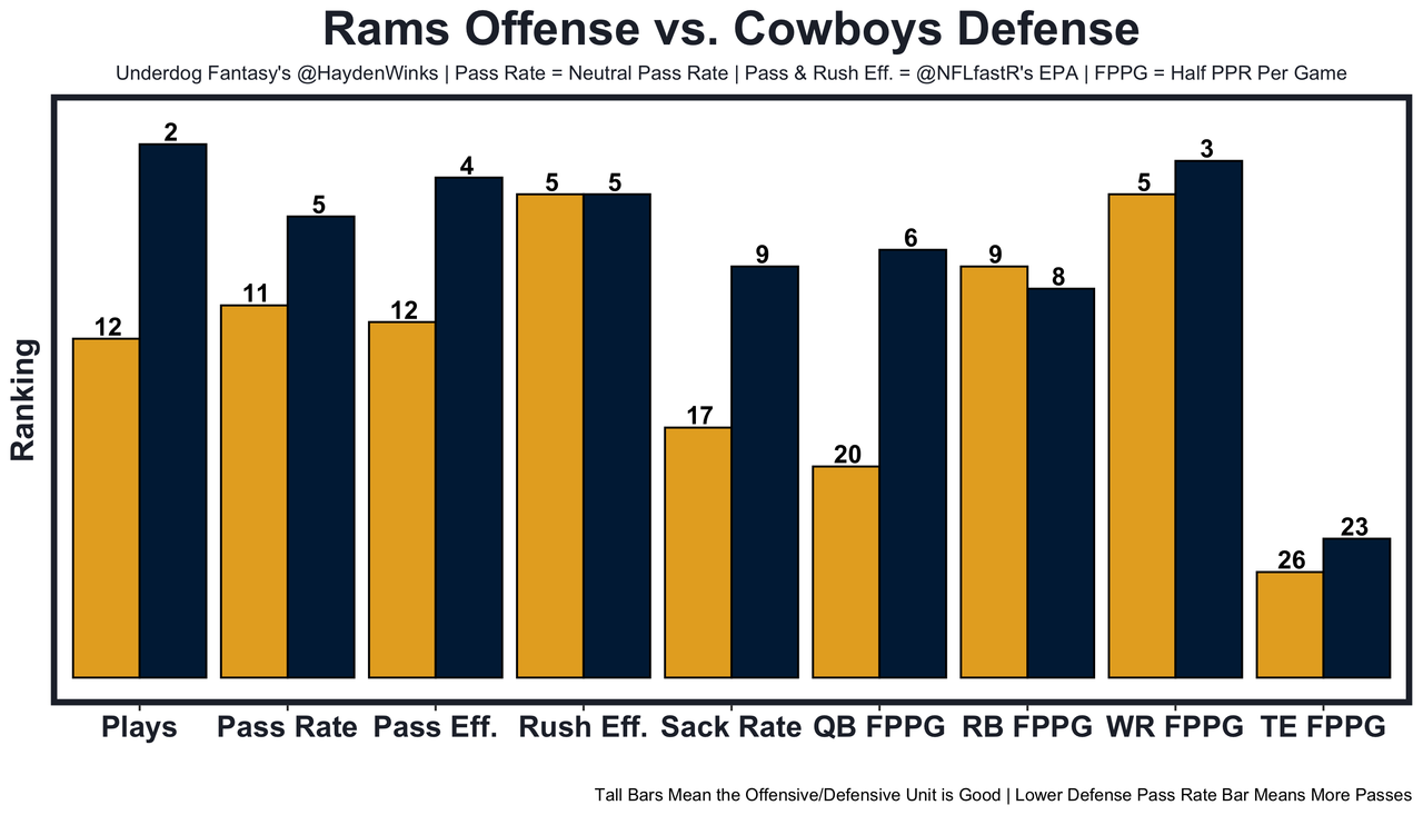 Dallas is 7th in projected points this week (25.75), and at some point, Prescott will benefit from positive regression in the red zone. Only 39% of their red zone drives have ended in a TD (26th) after they converted 71% (1st) last season. The Cowboys are coming off their bye here and had their starting 5 OL back in the starting lineup back in Week 6. Even with Aaron Donald, the Rams are just 28th in sack rate, so Prescott should have time to dice up an inexperienced secondary. It's fully time to panic if things don't correct here.
