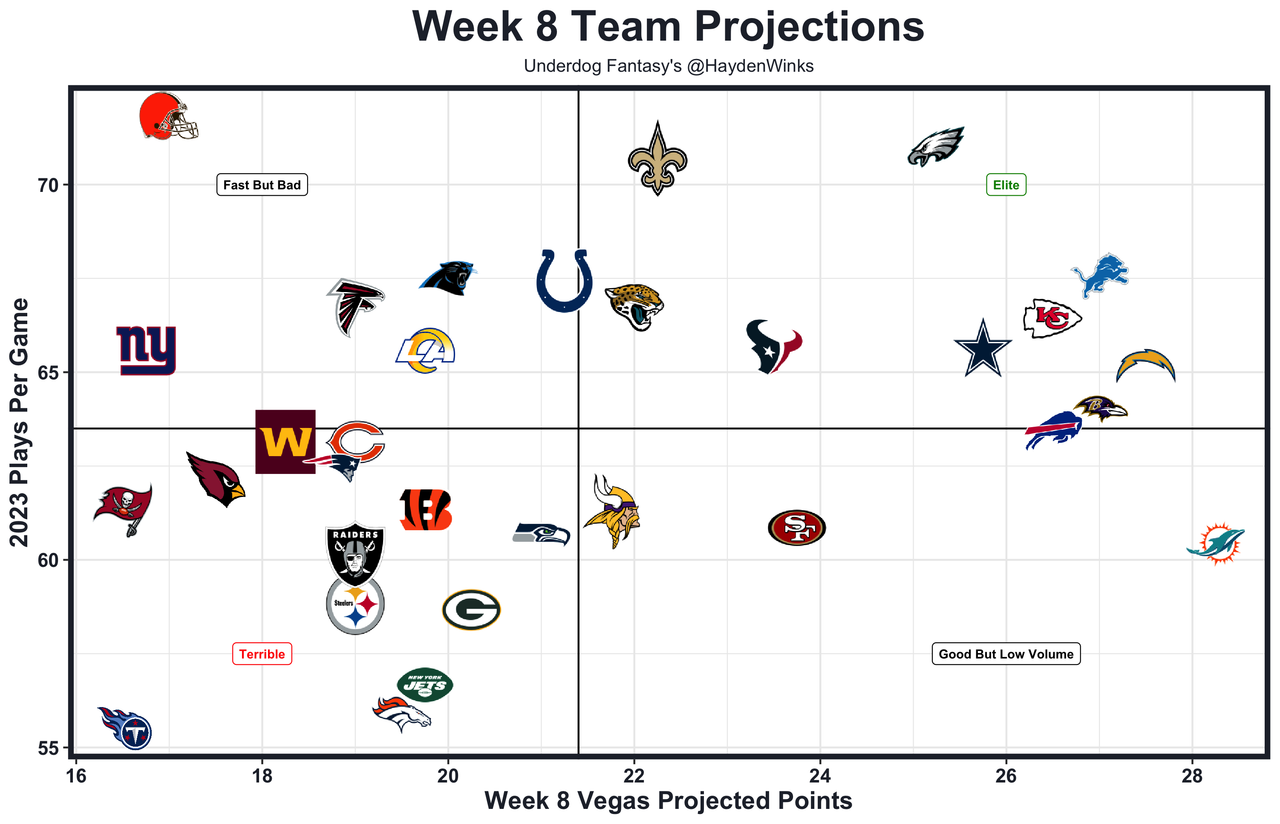 Saquon Barkley - He's had 24.4 and 16.1 expected half PPR points since returning, and Saquon has made a few splash plays on tape. It's possible Daniel Jones, LT Andrew Thomas, and C John Michael-Schmitz return this week, but Saquon's role is very hard to fail in even if they can't suit up. That said, the Giants project for a silly 16.75 points this week. Only the Titans are in a worse spot. 96.5 total yards in Pick'em.