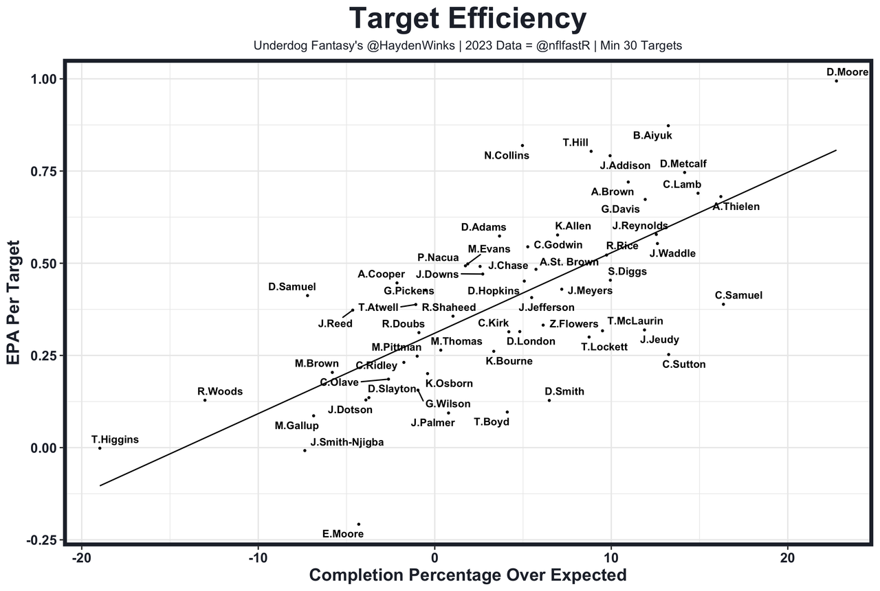 DJ Moore - It's unrealistic for Moore to continue the pace of this chart, even if we agree he's a really good player. That said, the Chargers are starting 2 of the bottom 6 PFF grade CBs right now following the JC Jackson trade. 58.5 receiving yards in Pick'em.